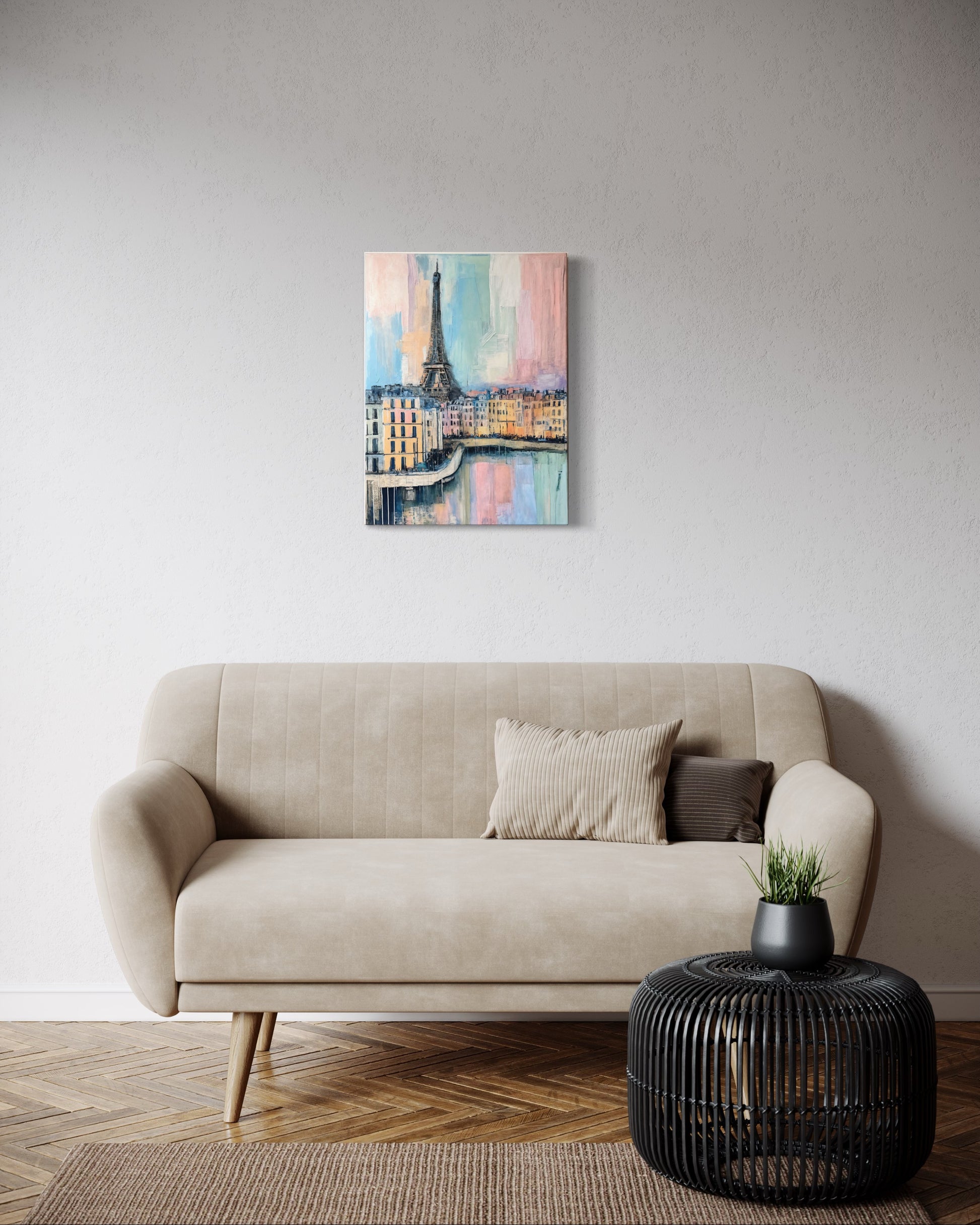 Mit sanften Pinselstrichen und einer meisterhaften Mischung aus zarten Rosa-, Blau- und Gelbtönen bringt dieses Gemälde die romantische Atmosphäre und die zeitlose Schönheit der Pariser Skyline perfekt zur Geltung. Die abstrakte Interpretation und die lebendige Farbpalette laden den Betrachter ein, in eine Welt voller Fantasie und Eleganz einzutauchen.