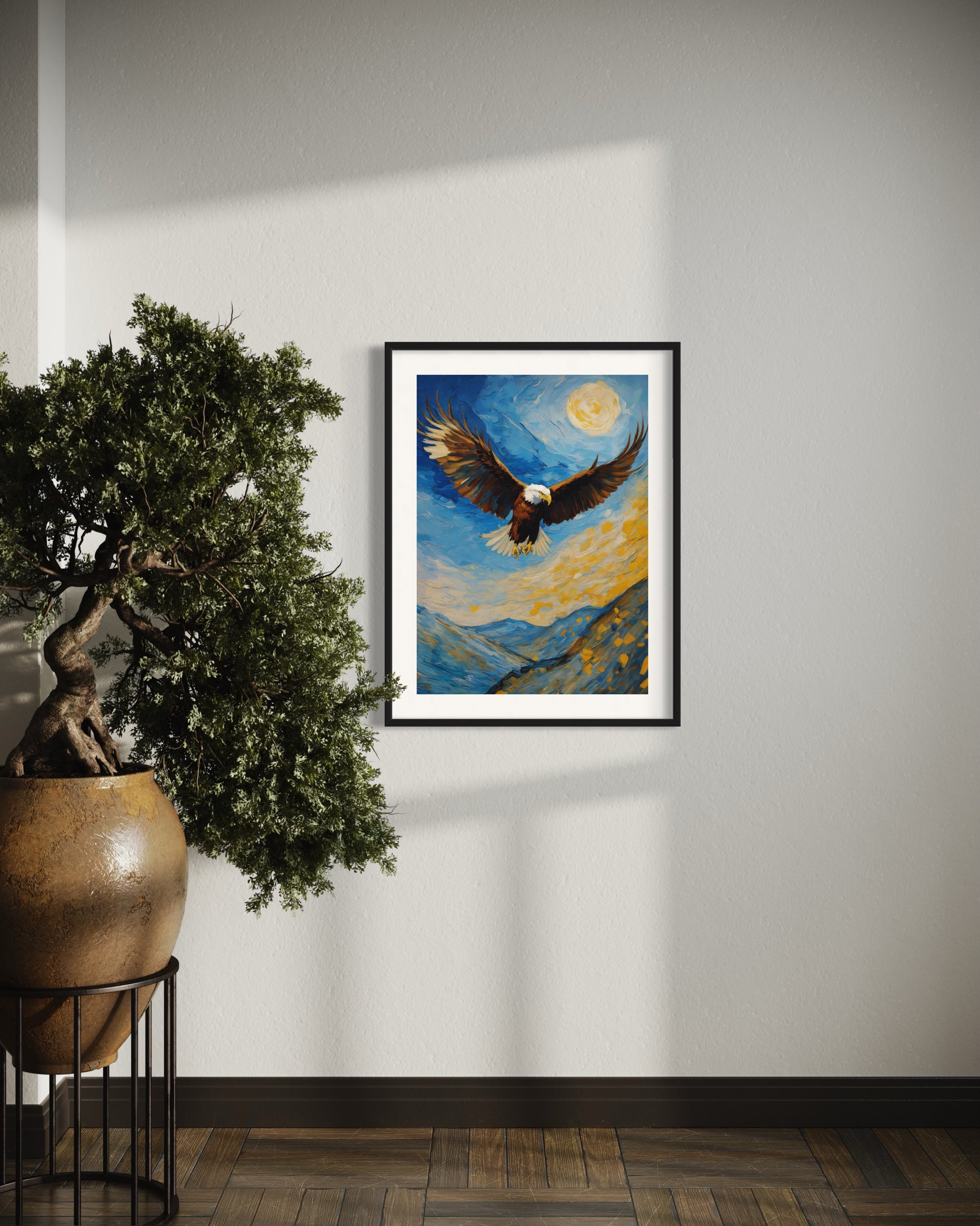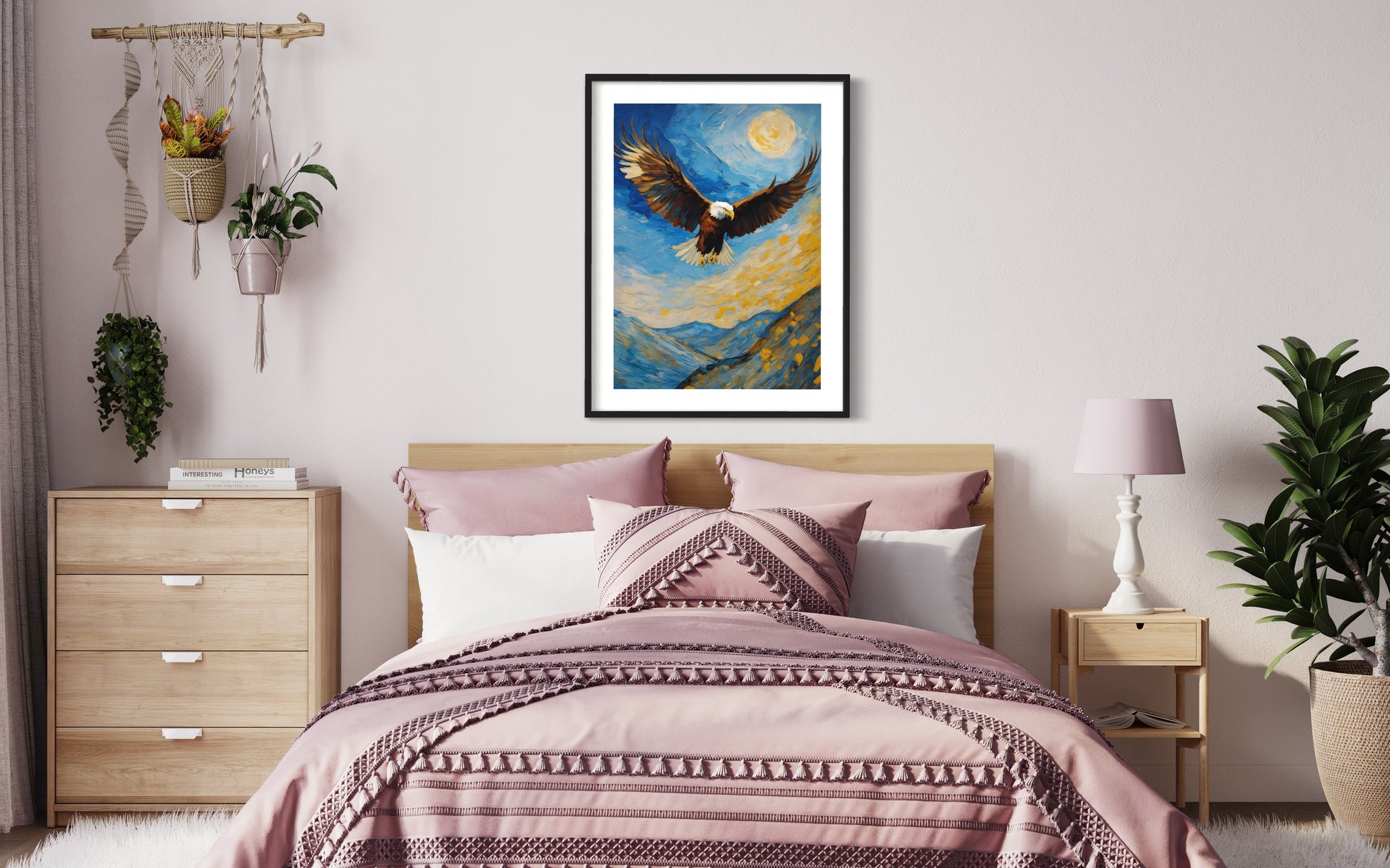 Insgesamt ist "Flying Eagle" ein kraftvolles Werk, das sowohl die Schönheit der Natur als auch die künstlerische Freiheit feiert. Es lädt den Betrachter ein, über die Grenzen der Realität hinauszudenken und sich in einer Welt zu verlieren, in der Form und Farbe nahtlos ineinander übergehen.