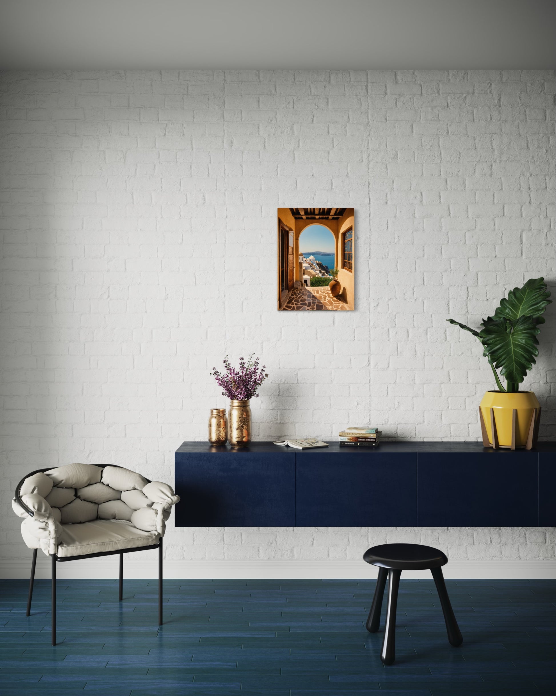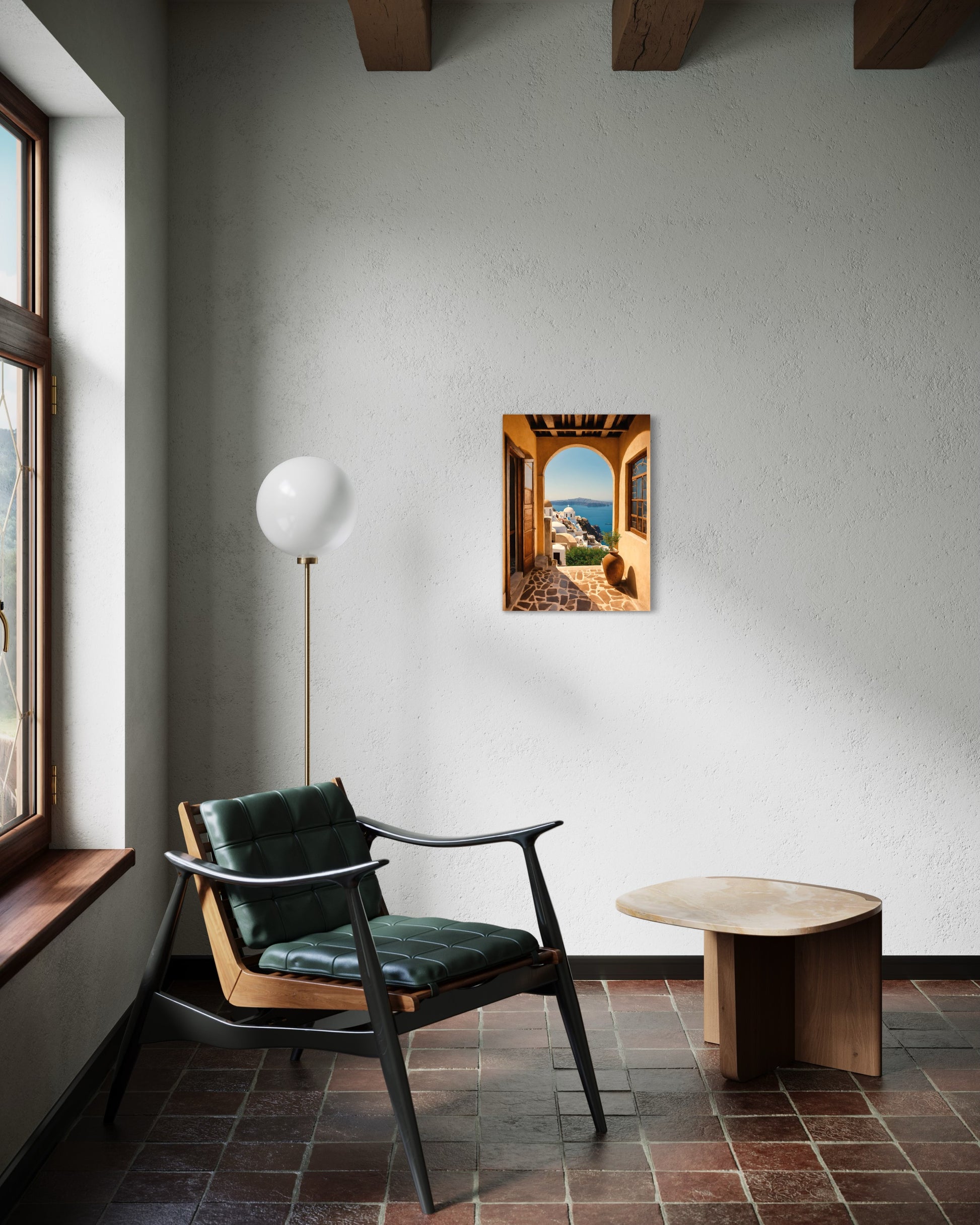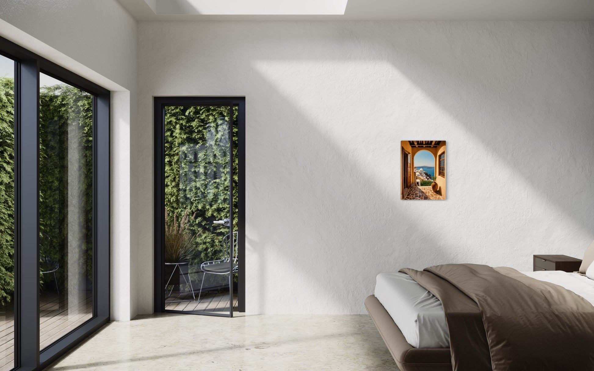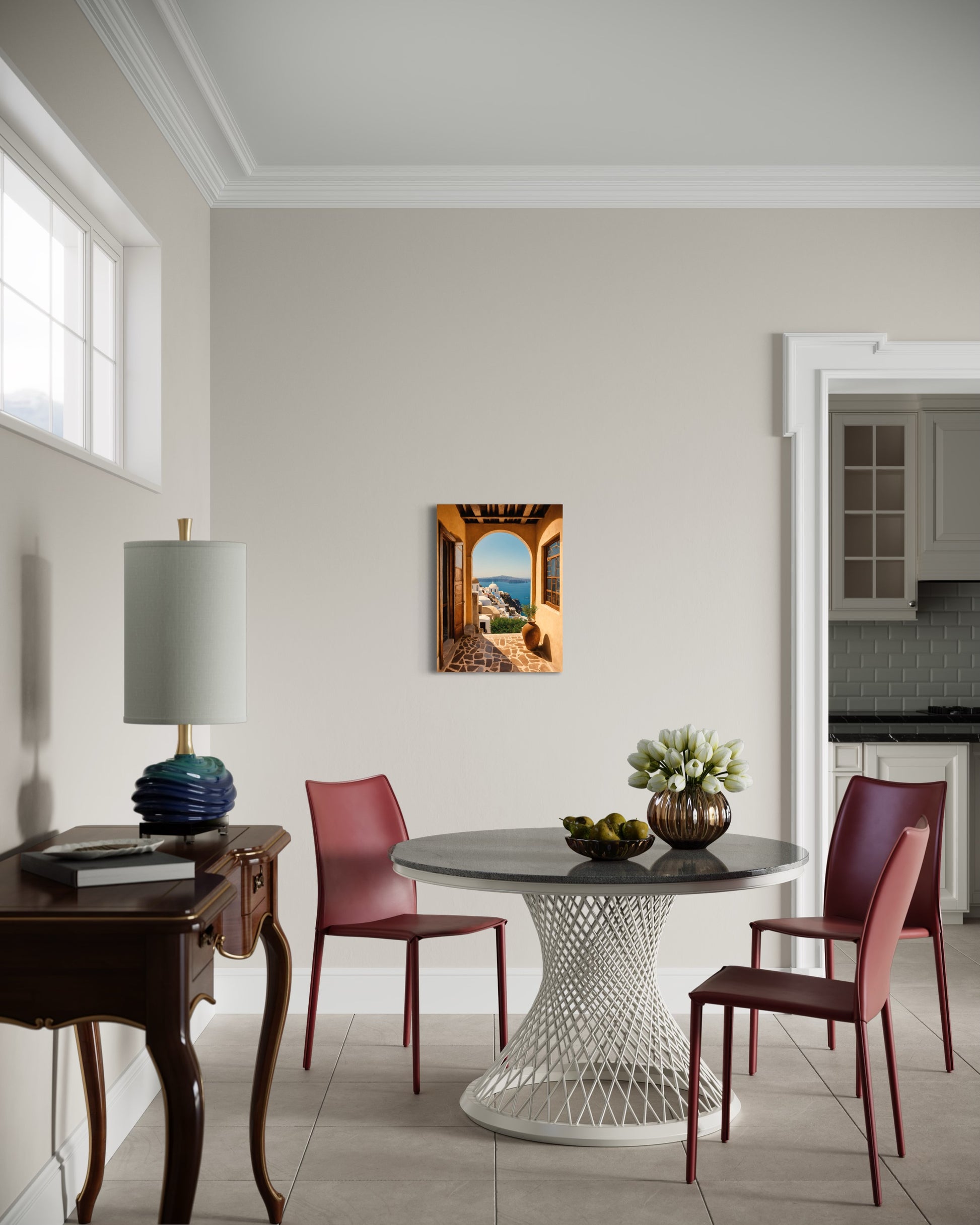 Entdecken Sie die Magie von Santorini - eine Insel, wo der Himmel das Meer küsst und die Sonne in ihren wärmsten Tönen leuchtet. Unser Bild „Santorini, Griechenland“ fängt die unvergleichliche Schönheit dieses paradiesischen Rückzugsortes ein. Blicken Sie durch den stimmungsvollen Bogen eines traditionellen, sonnenverwöhnten Hauses hinaus auf das unendliche Blau der Ägäis. Lassen Sie Ihren Blick über die ikonischen, weißen Kuppeln der Kirchen wandern, die sich wie Perlen an den Klippen entlangschmiegen. Die malerische Stille wird nur durch das sanfte Rauschen der Wellen unterbrochen. Dieses Bild ist mehr als nur eine Aufnahme; es ist eine Einladung in eine Welt voller Ruhe, Schönheit und Inspiration. Bringen Sie die Essenz von Santorini in Ihr Heim oder Büro und lassen Sie sich täglich von der atemberaubenden Kulisse dieser Insel verzaubern.