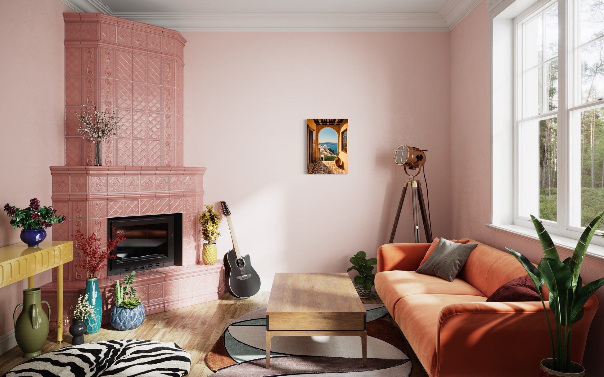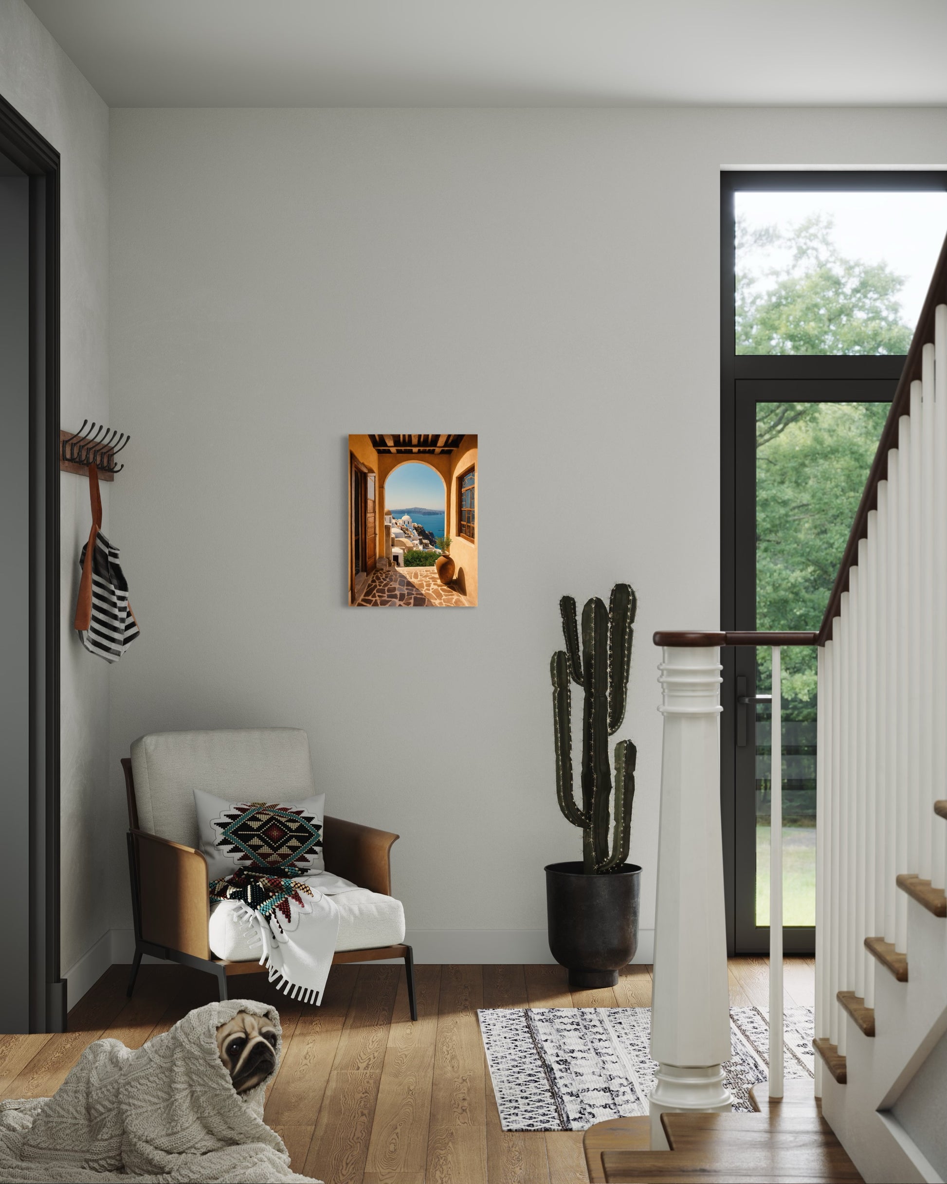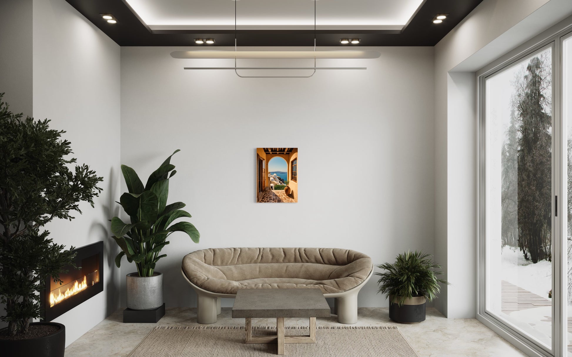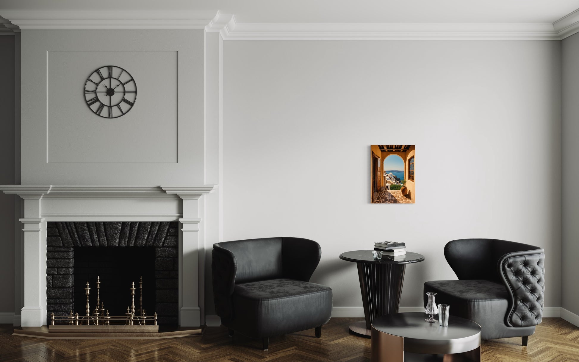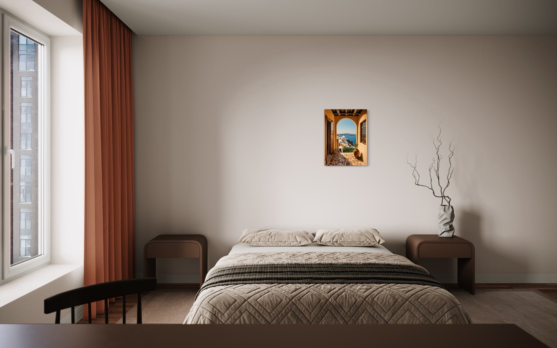 Entdecken Sie die Magie von Santorini - eine Insel, wo der Himmel das Meer küsst und die Sonne in ihren wärmsten Tönen leuchtet. Unser Bild „Santorini, Griechenland“ fängt die unvergleichliche Schönheit dieses paradiesischen Rückzugsortes ein. Blicken Sie durch den stimmungsvollen Bogen eines traditionellen, sonnenverwöhnten Hauses hinaus auf das unendliche Blau der Ägäis. Lassen Sie Ihren Blick über die ikonischen, weißen Kuppeln der Kirchen wandern, die sich wie Perlen an den Klippen entlangschmiegen. Die malerische Stille wird nur durch das sanfte Rauschen der Wellen unterbrochen. Dieses Bild ist mehr als nur eine Aufnahme; es ist eine Einladung in eine Welt voller Ruhe, Schönheit und Inspiration. Bringen Sie die Essenz von Santorini in Ihr Heim oder Büro und lassen Sie sich täglich von der atemberaubenden Kulisse dieser Insel verzaubern.
