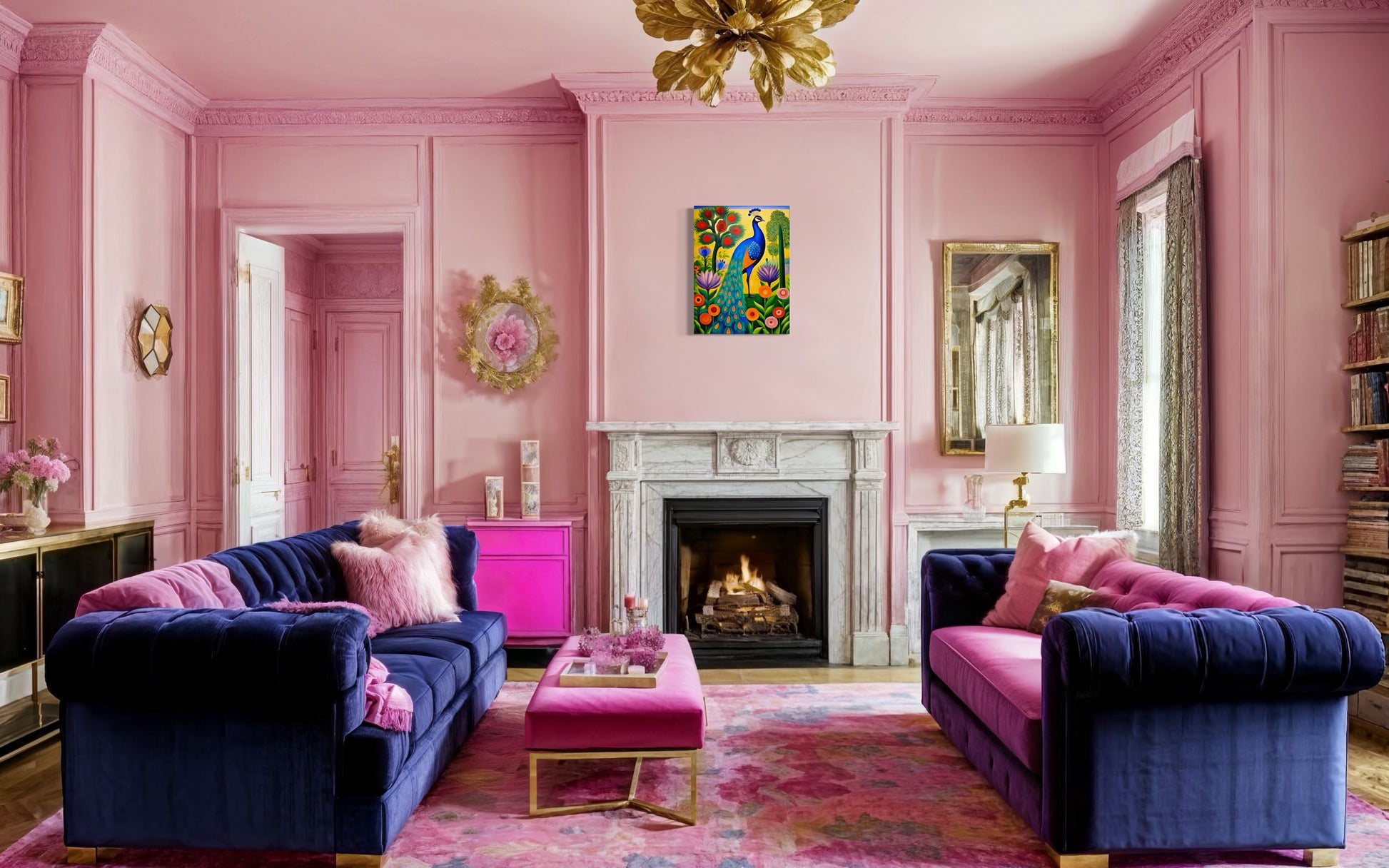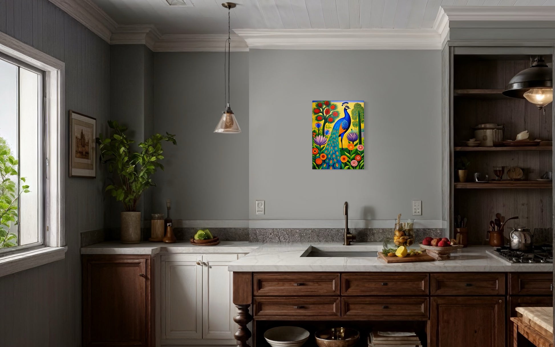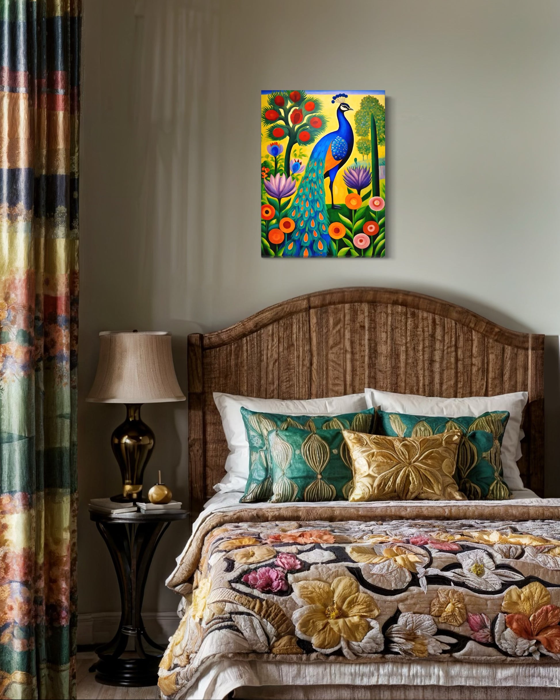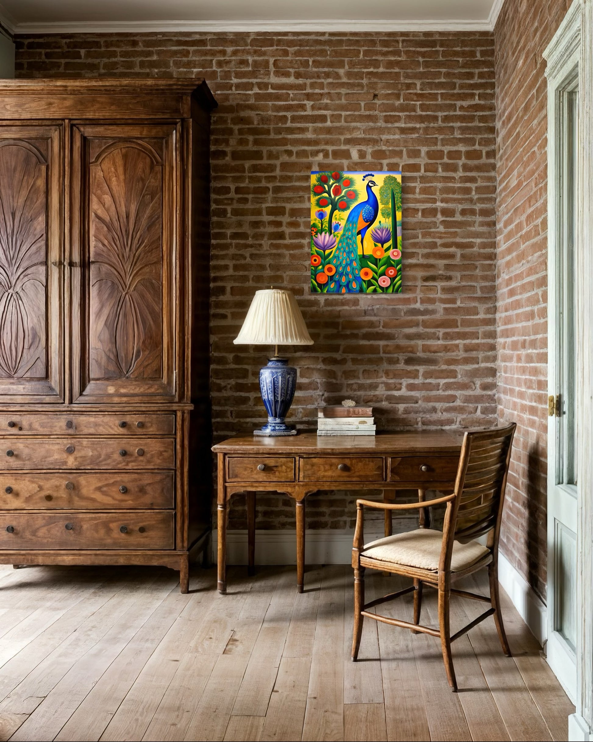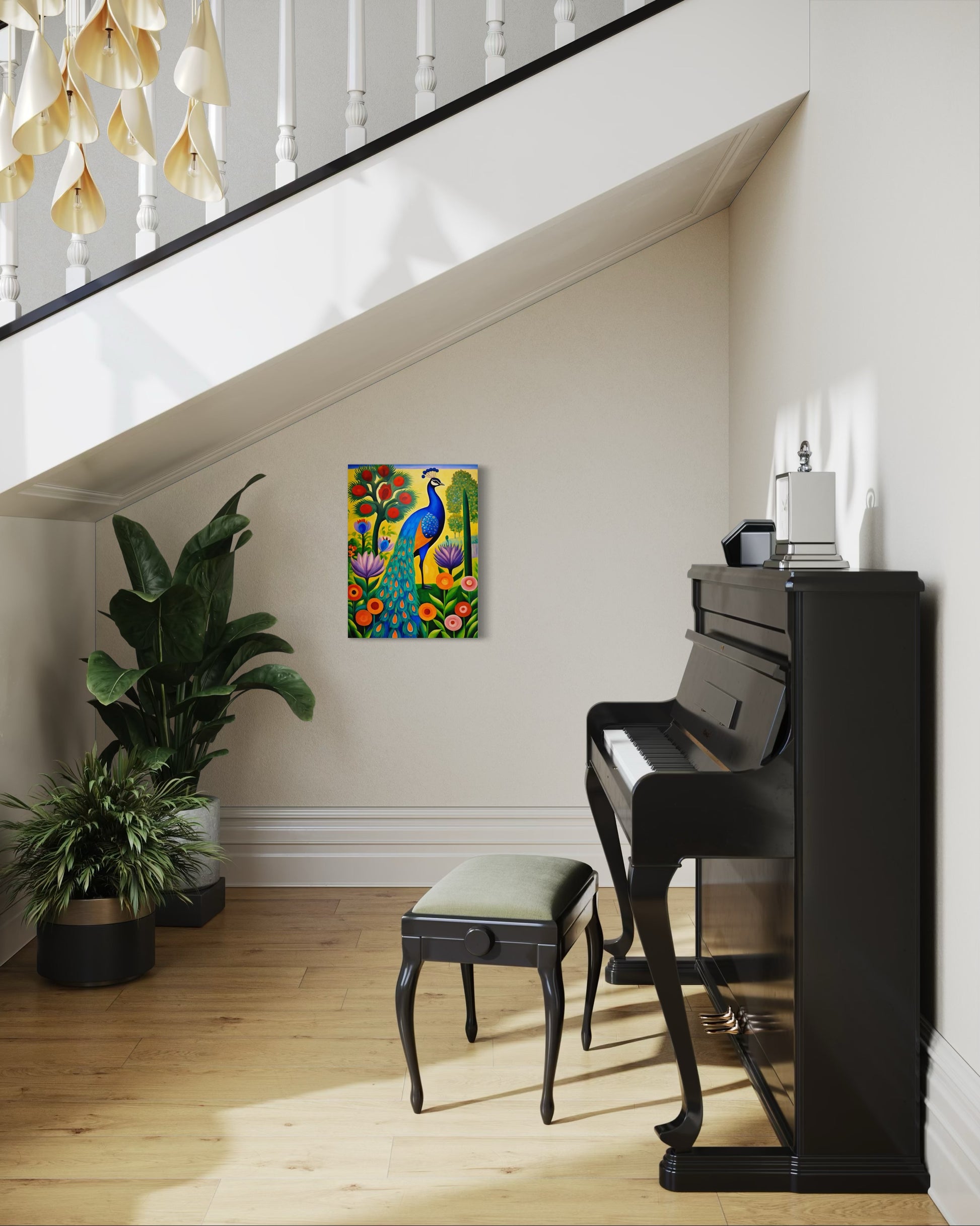 🦚 „The Garden of Majesty“ ist ein farbenfrohes, exklusives Kunstwerk, das einen prächtigen Pfau inmitten eines tropischen Gartens zeigt. Inspiriert vom lateinamerikanischen Modernismus sowie Künstlern wie Tarsila do Amaral und Henri Matisse, vereint das Gemälde Symbolkraft, Eleganz und Lebensfreude in einer dynamischen Komposition. Leuchtende Farben wie Gelb, Grün, Blau und Orange bringen Energie und Stil in jeden Raum – perfekt für Liebhaber einzigartiger und ausdrucksstarker Kunst.