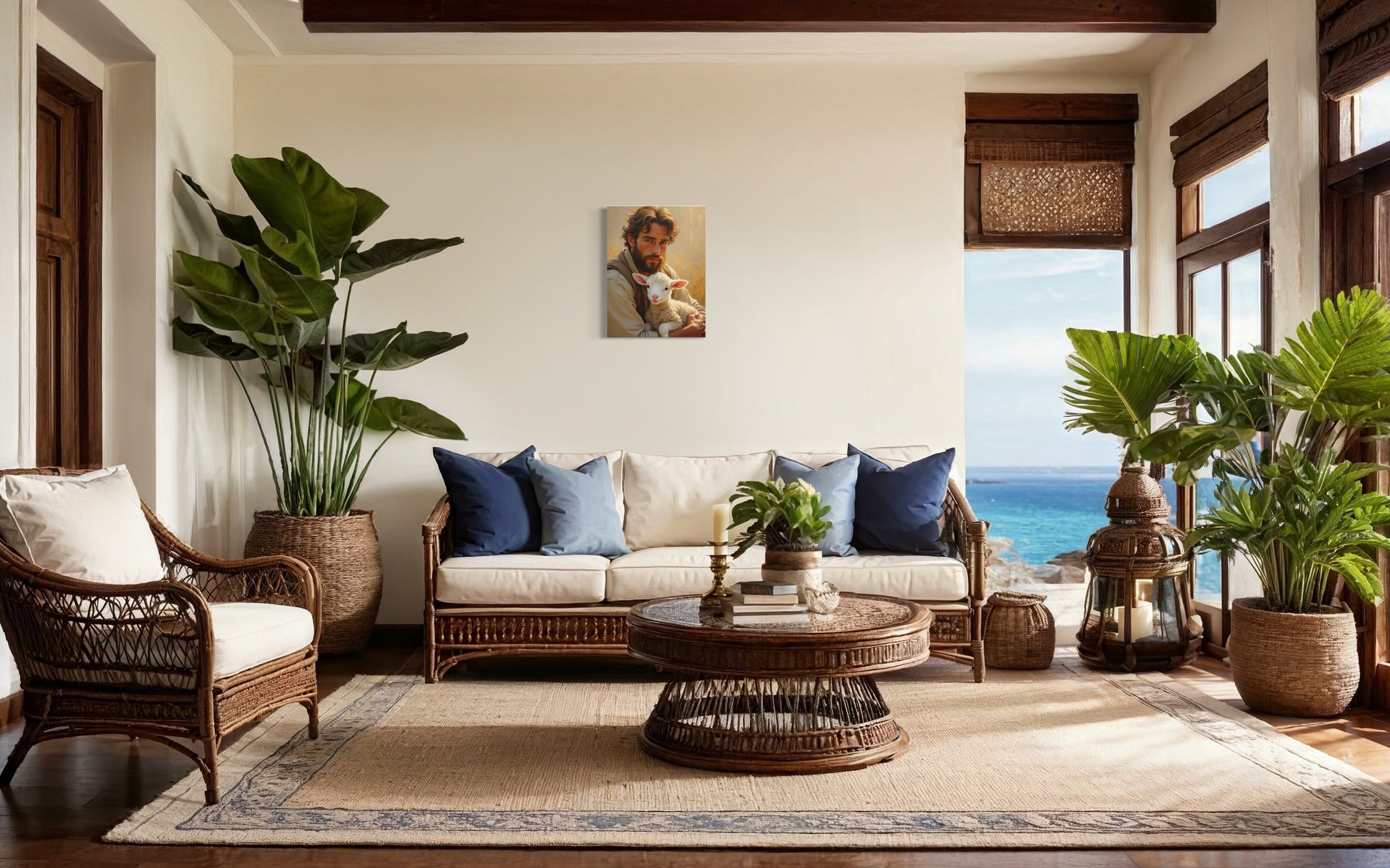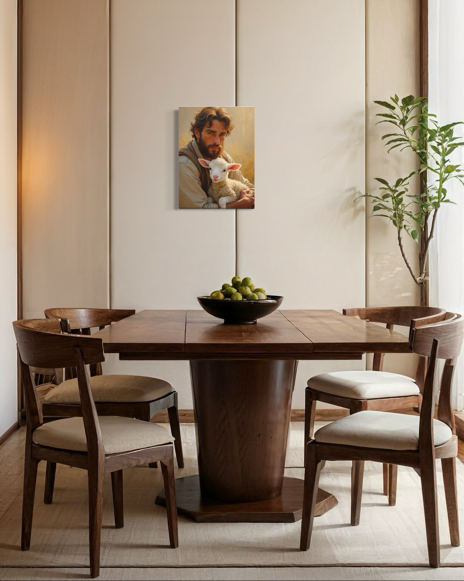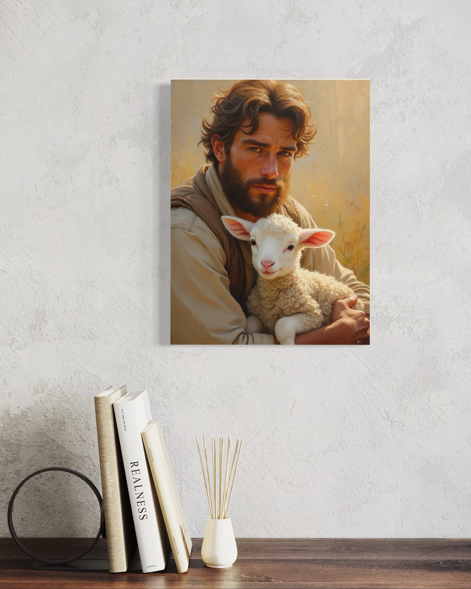 Diese eindrucksvolle Darstellung des guten Hirten berührt durch ihre emotionale Tiefe und visuelle Harmonie. Ein junger Mann hält ein Lamm in den Armen – Symbol für Fürsorge, Vertrauen und geistige Ruhe. Die warme Farbpalette, das sanfte Licht und die realistische Darstellung schaffen eine Atmosphäre voller Frieden.