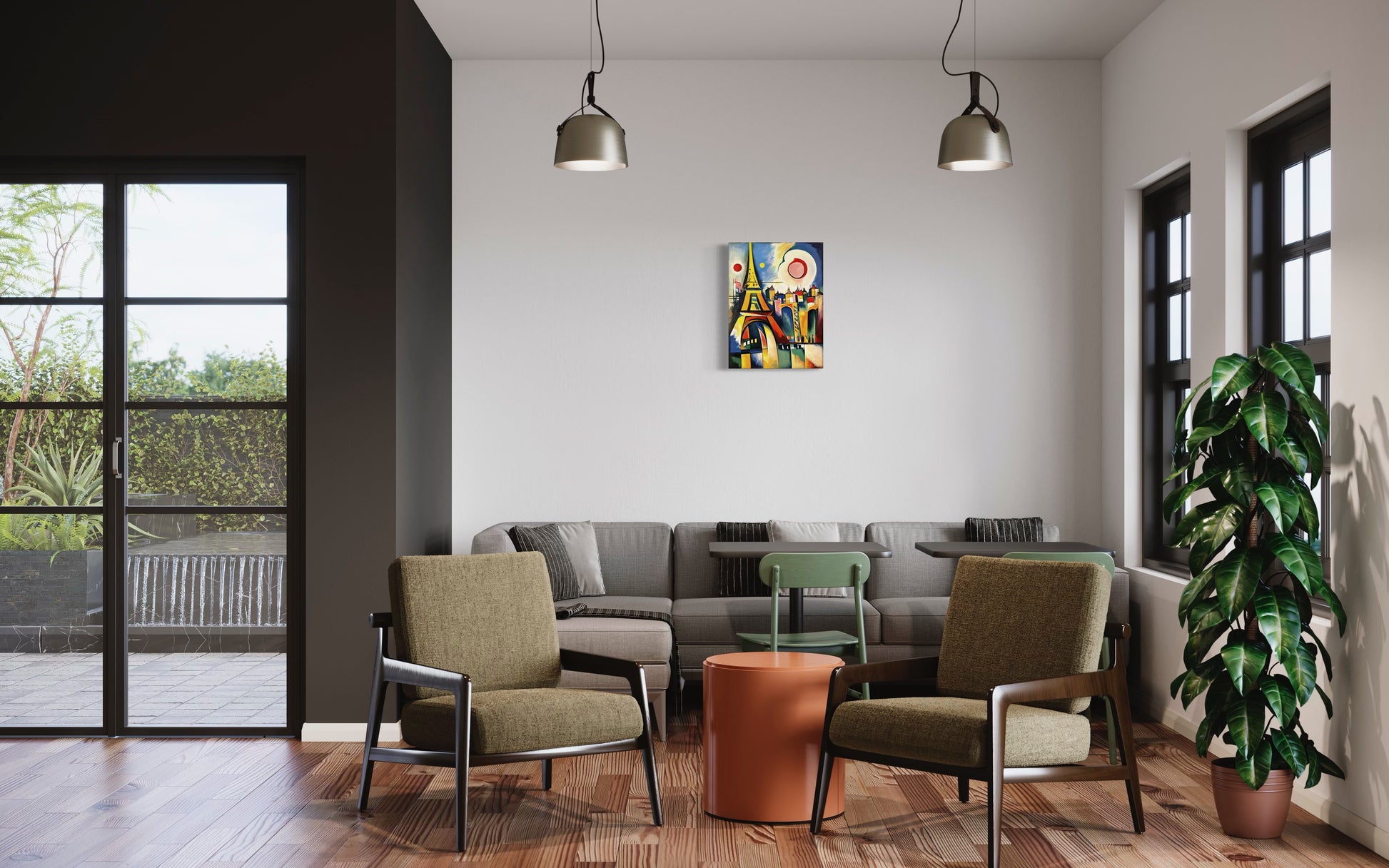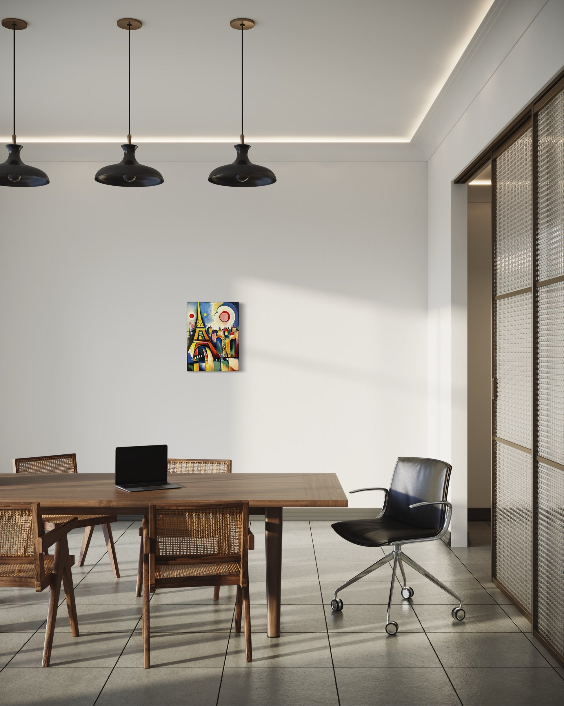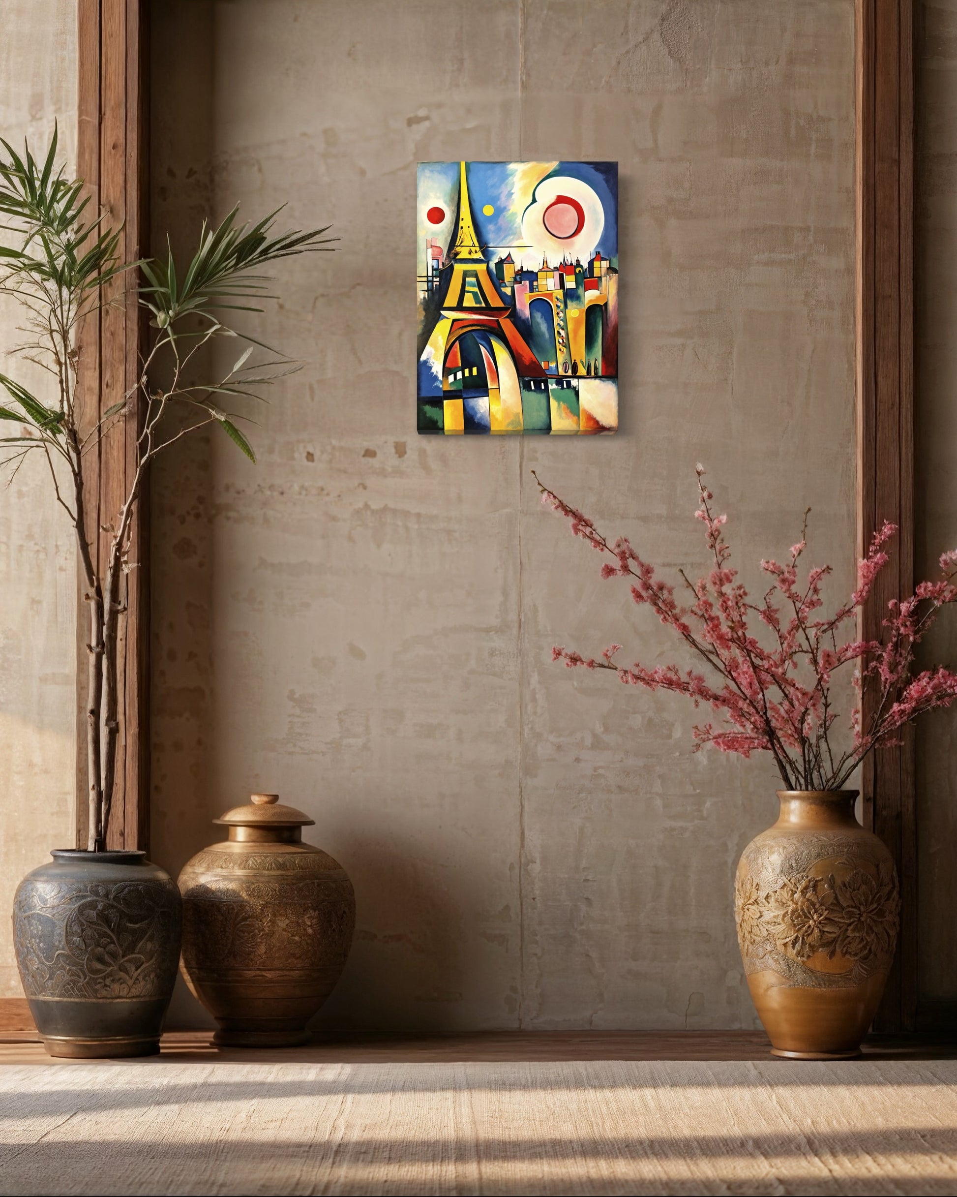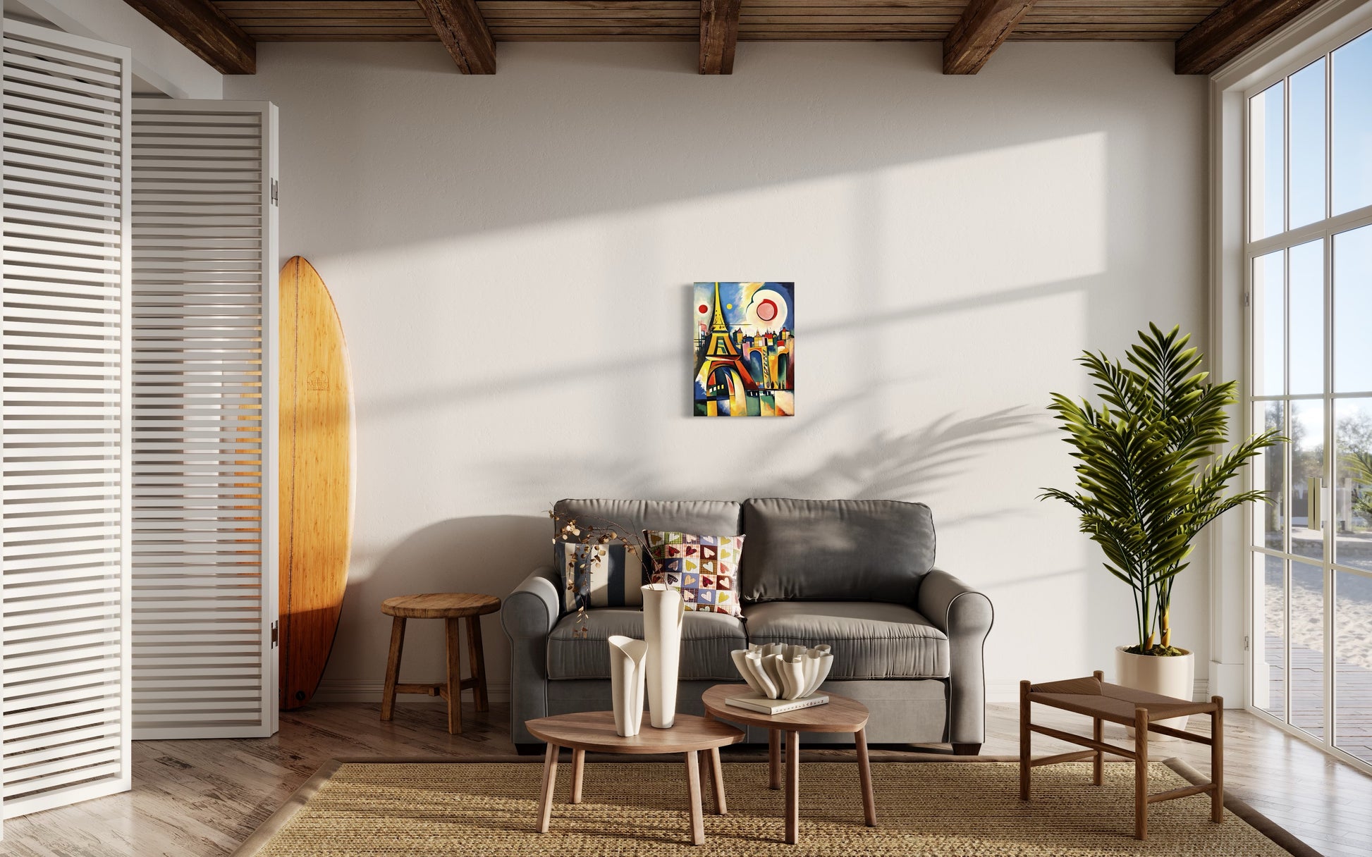 "Vibrant Parisian Dreams" ist ein farbenfrohes und lebendiges Gemälde, das die Essenz der Stadt der Lichter einfängt. Mit kräftigen Farben und dynamischen Formen wird die ikonische Silhouette des Eiffelturms und die charmante Architektur von Paris auf eine völlig neue, moderne Art und Weise dargestellt.
