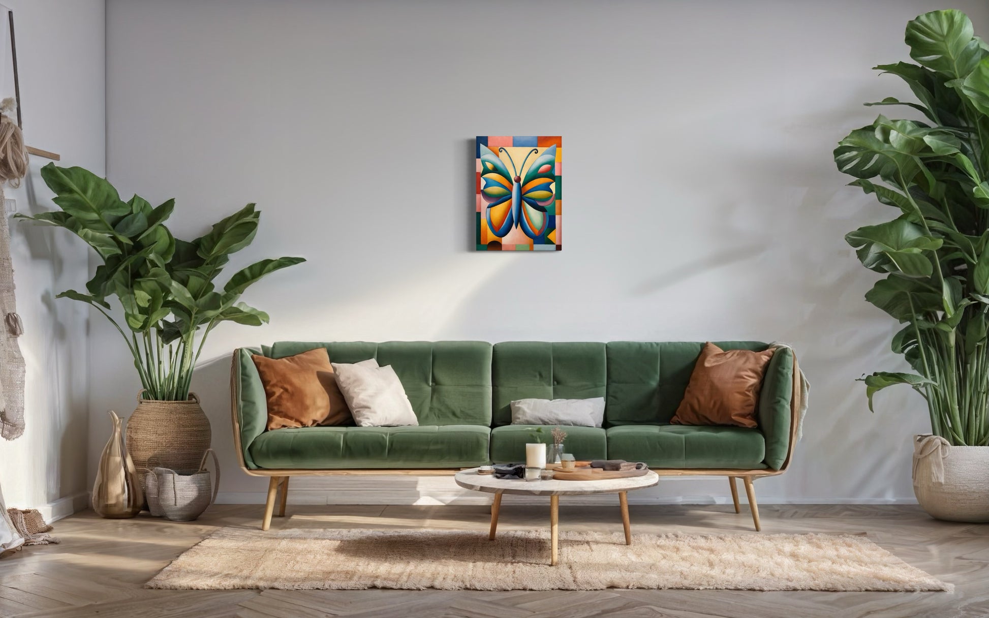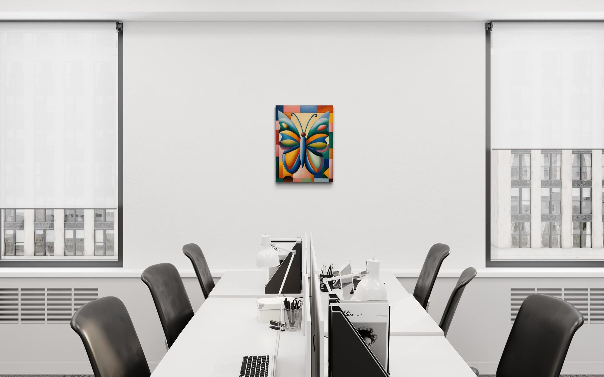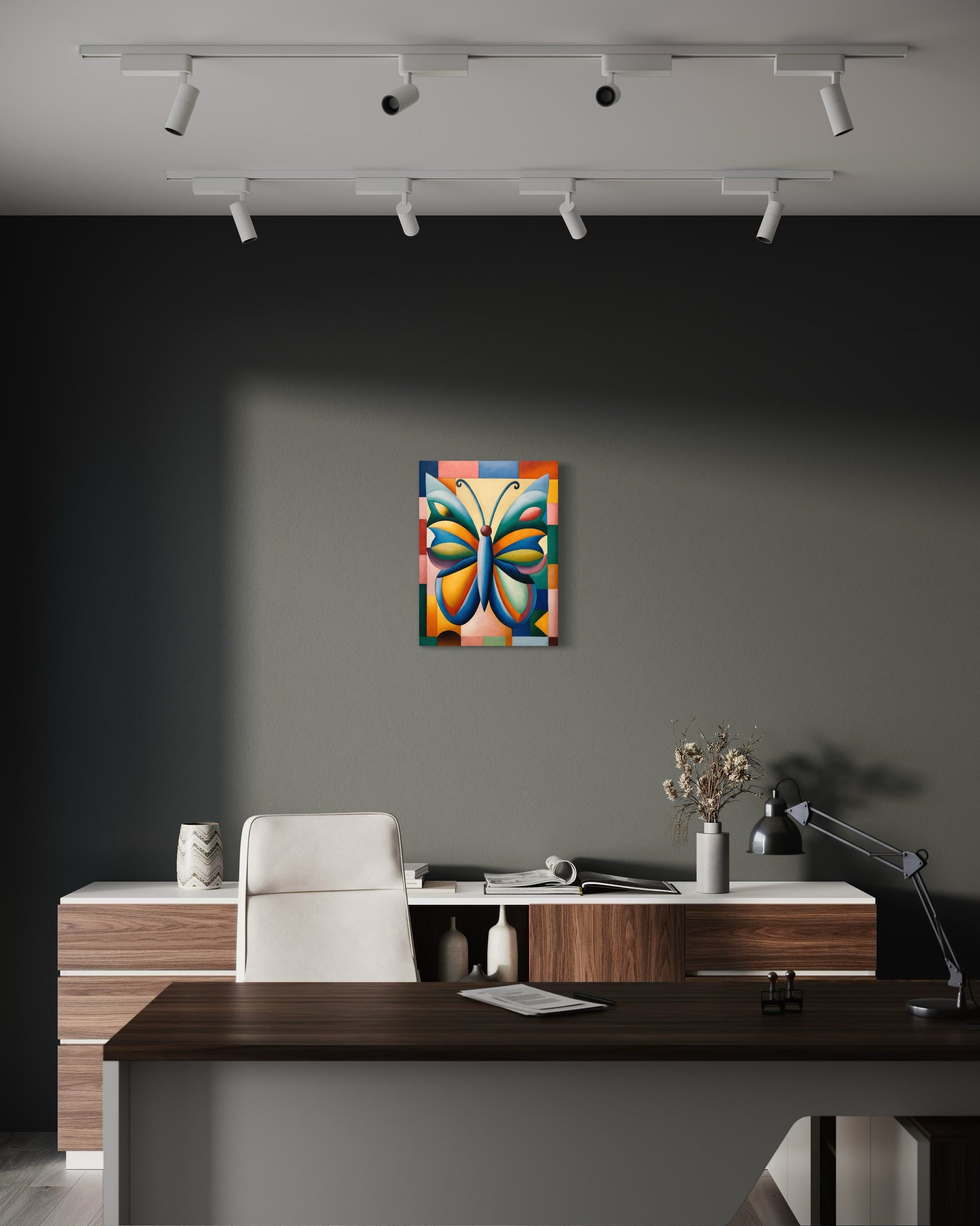 Visuelle Beschreibung: Das Werk zeigt einen lebendigen und stilisierten Schmetterling, der im Zentrum der Komposition positioniert ist. Die Flügel des Schmetterlings sind reich in Blau-, Orange-, Grün- und Gelbtönen gefärbt, was einen markanten und harmonischen Kontrast erzeugt. Der Hintergrund besteht aus geometrischen Formen und Farbblöcken, die den modernen Stil des Werkes unterstreichen, mit Quadraten und Rechtecken in Rosa-, Grün- und Blautönen.