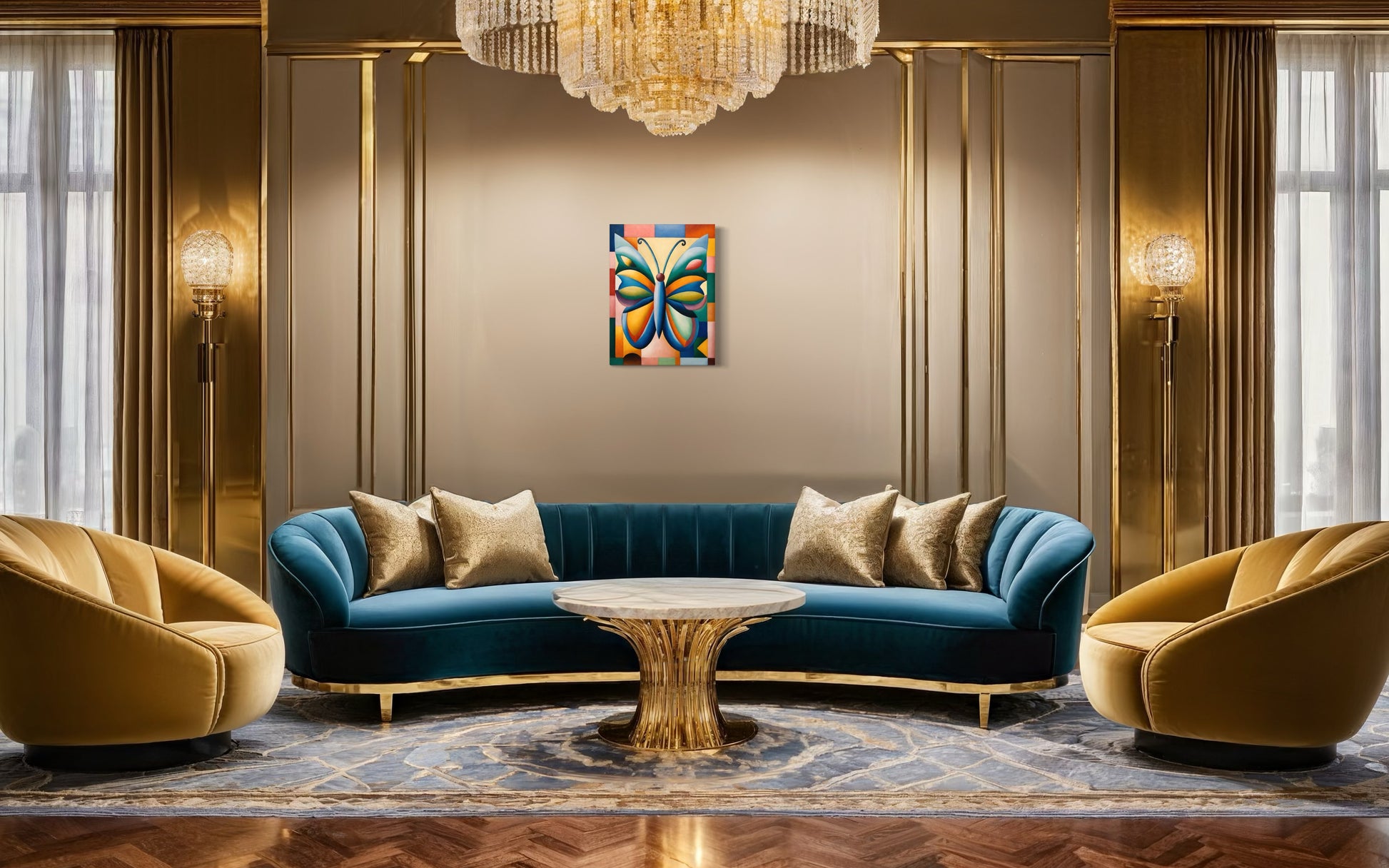 Emotionale Wirkung: Die Wahl der Farben und das Design des Schmetterlings erzeugen einen visuellen Effekt von Freude und Dynamik. Das Werk lädt den Betrachter dazu ein, die Schönheit der Farben zu erkunden und den Schmetterling nicht nur als zartes Wesen, sondern als eine Explosion von Leben und Energie zu betrachten. Der geometrische Hintergrund verstärkt diese Wahrnehmung und bringt ein Gefühl von Struktur und Modernität in die Komposition.