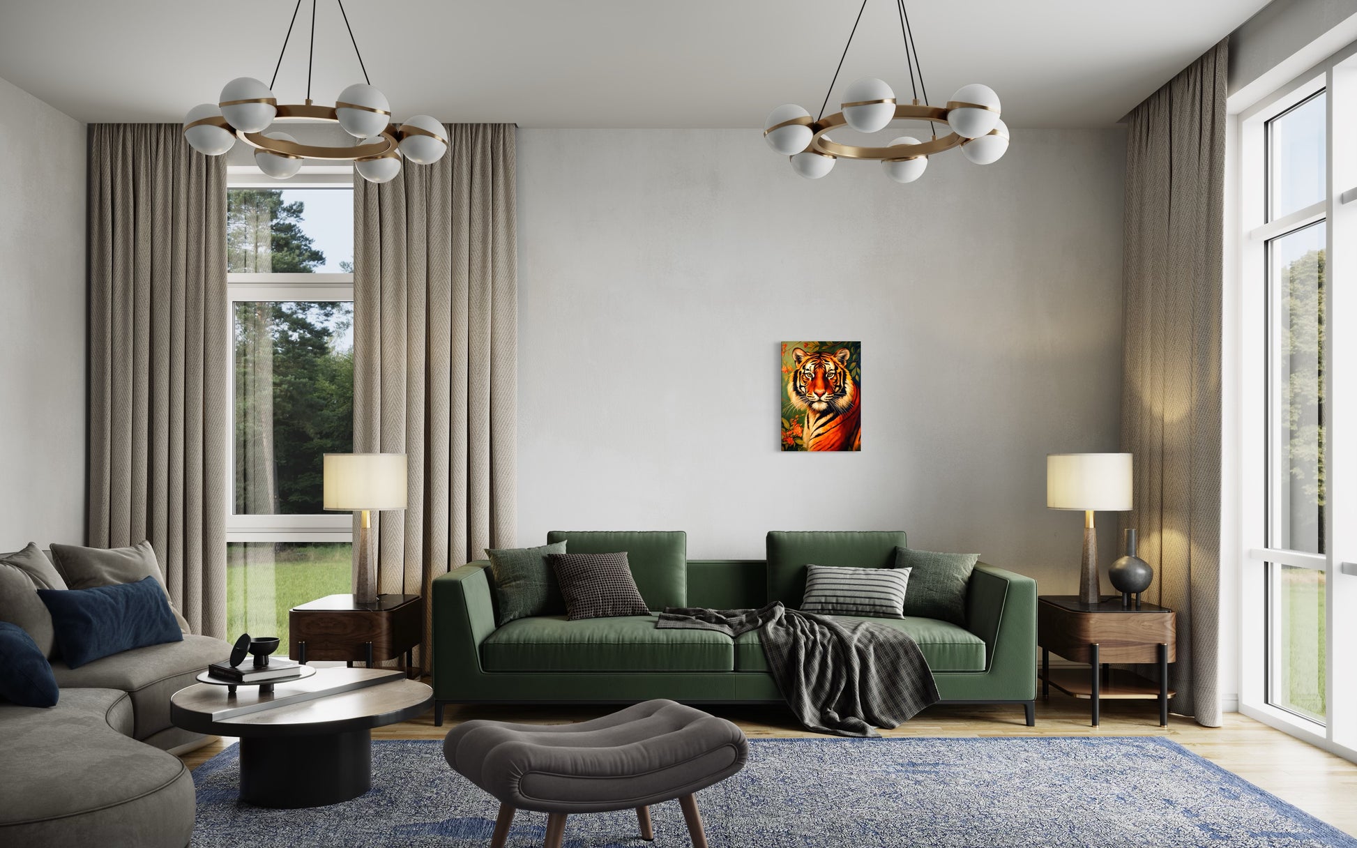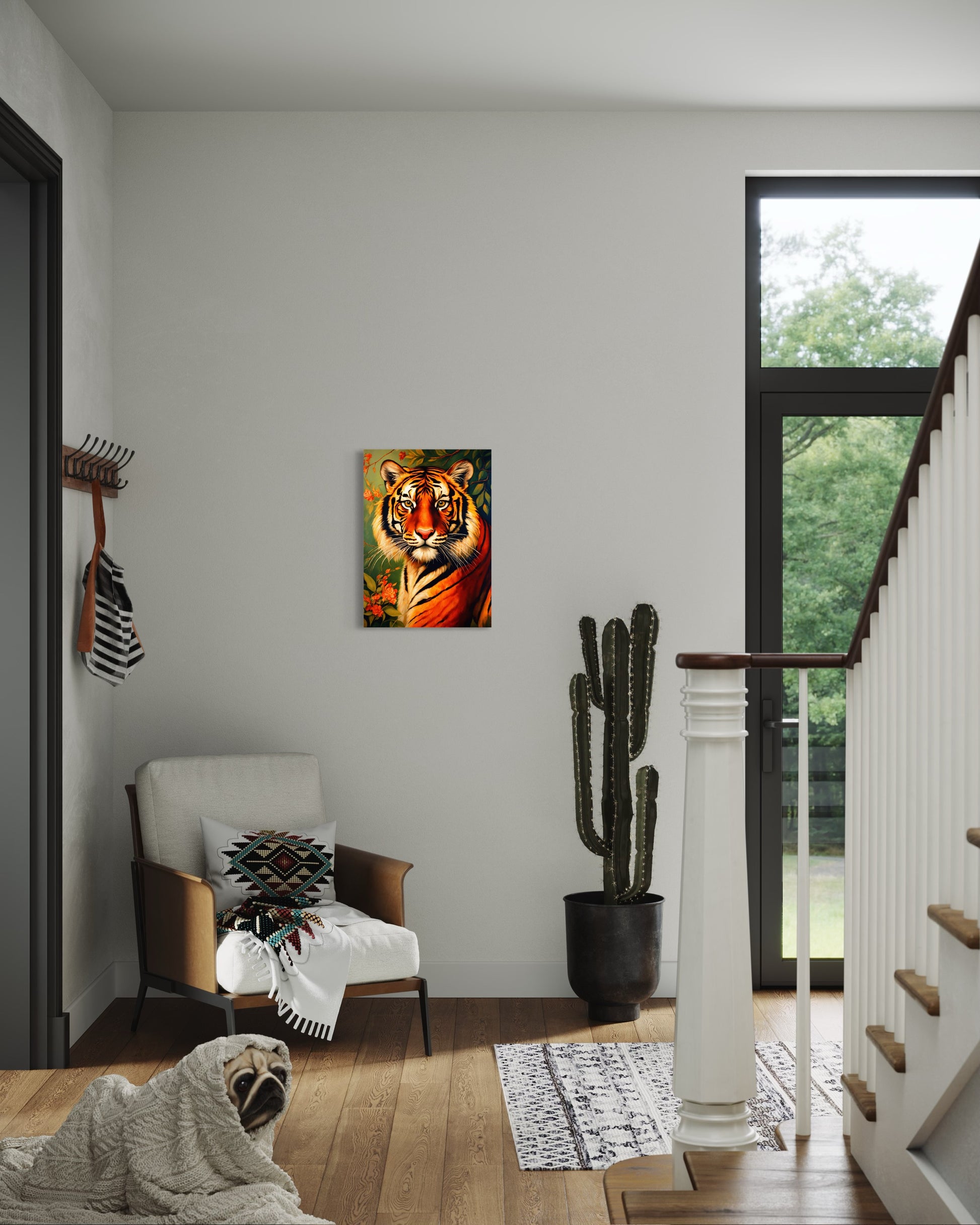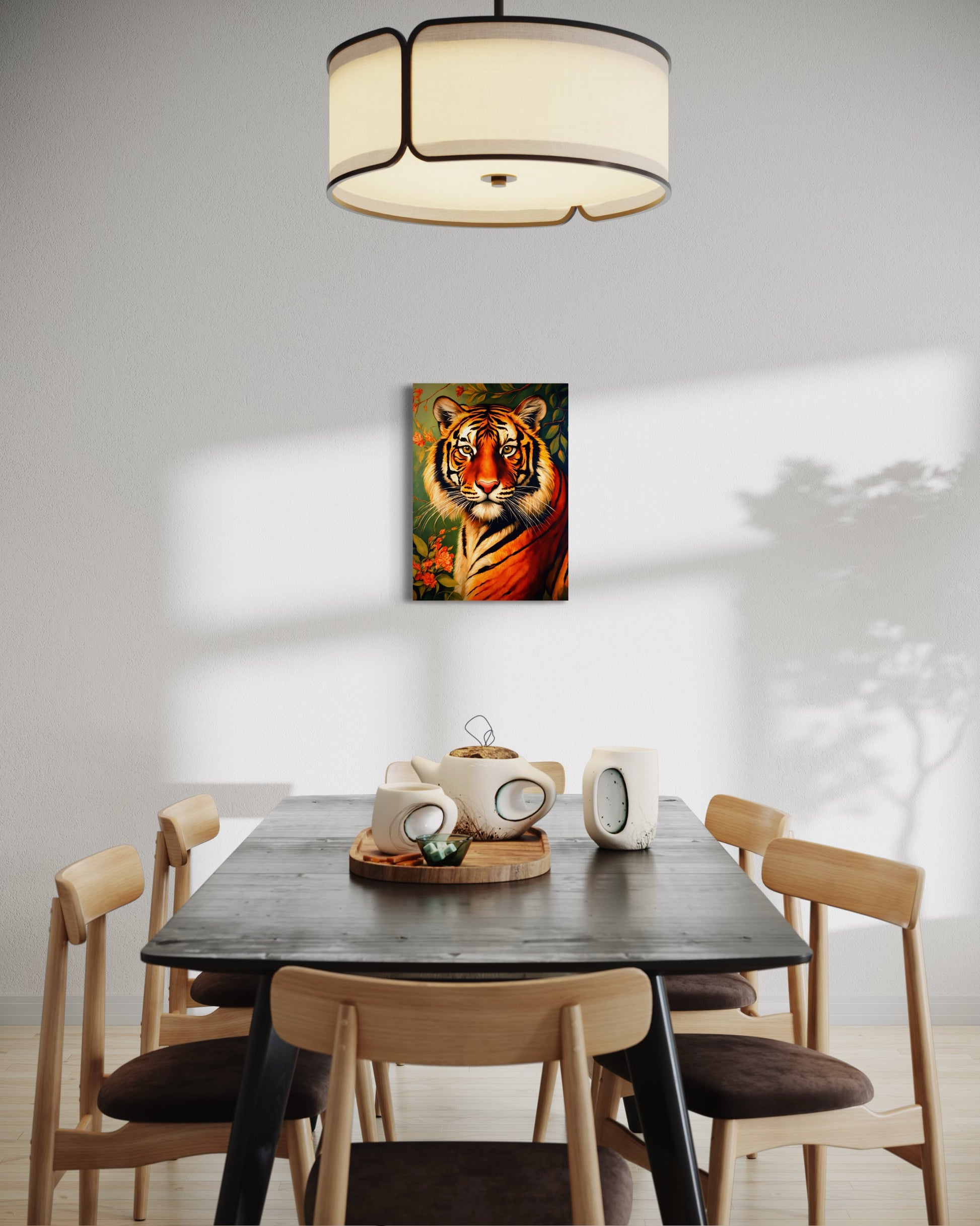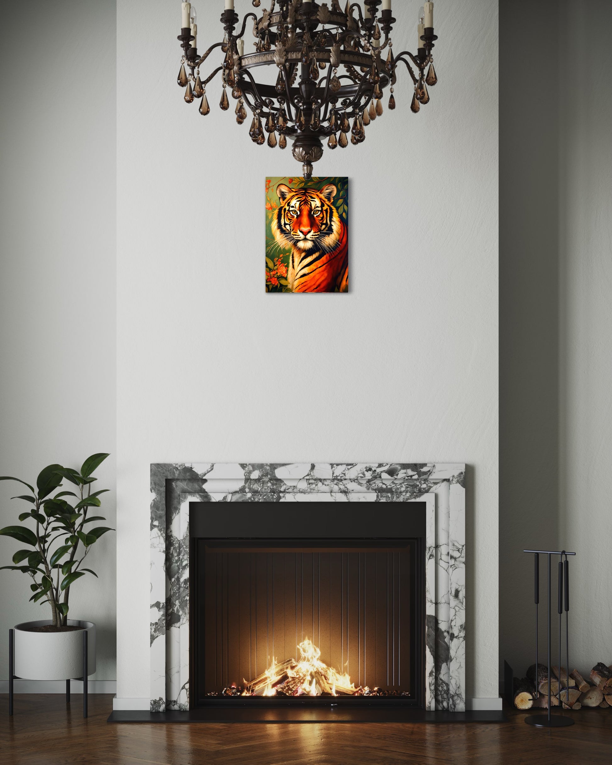 Die Wahl der Komposition – der Tiger, der den Betrachter direkt anschaut – vermittelt Stärke, Selbstbewusstsein und eine Art stiller Wildheit. Das Bild strahlt eine kraftvolle Präsenz aus und verleiht dem Raum, in dem es aufgehängt wird, einen dynamischen, lebendigen Charakter. Die Kombination aus realistischer Darstellung und einem leicht stilisierten Hintergrund gibt dem Werk eine zeitlose Qualität, die sowohl in modernen als auch in klassischen Interieurs Platz finden kann.