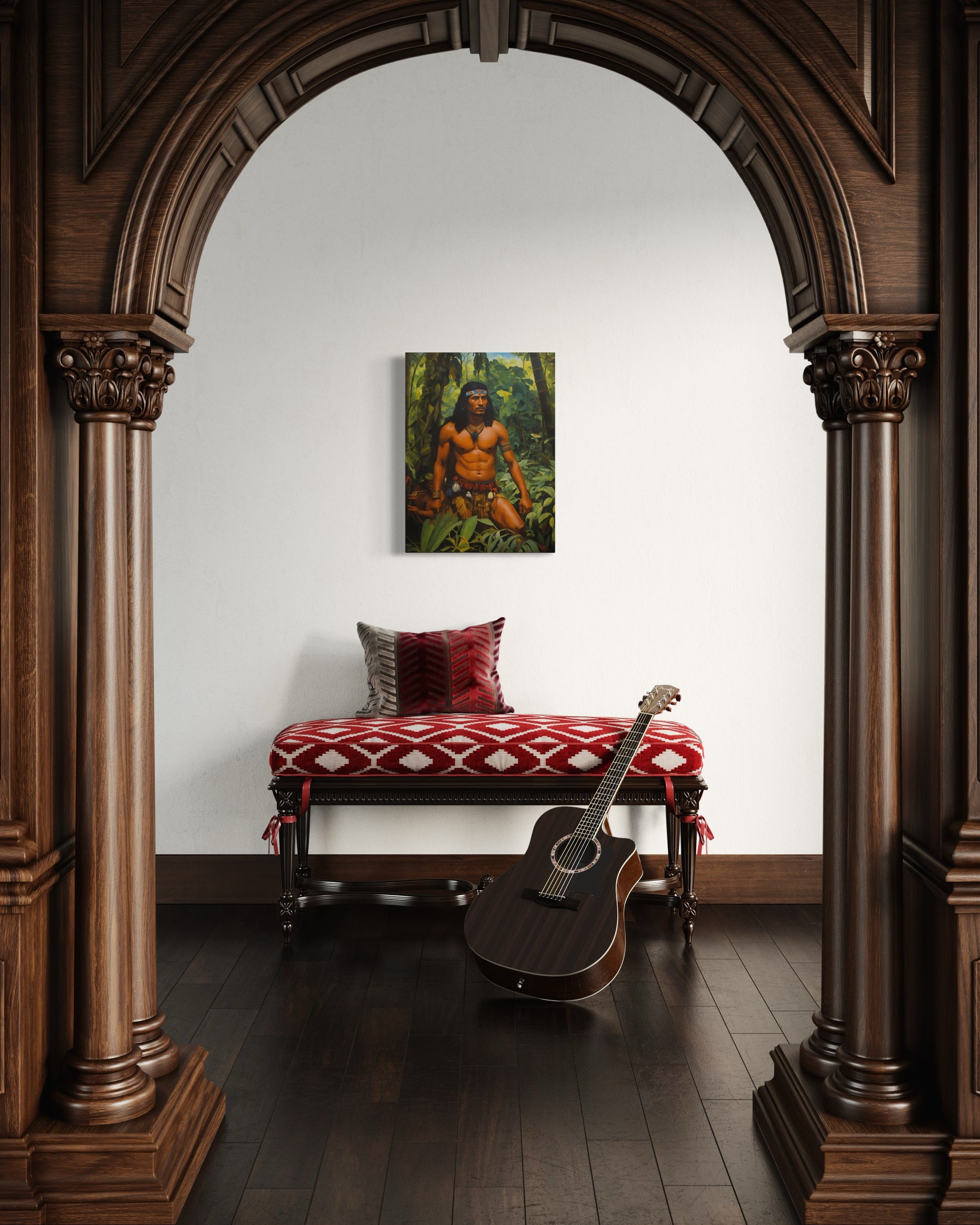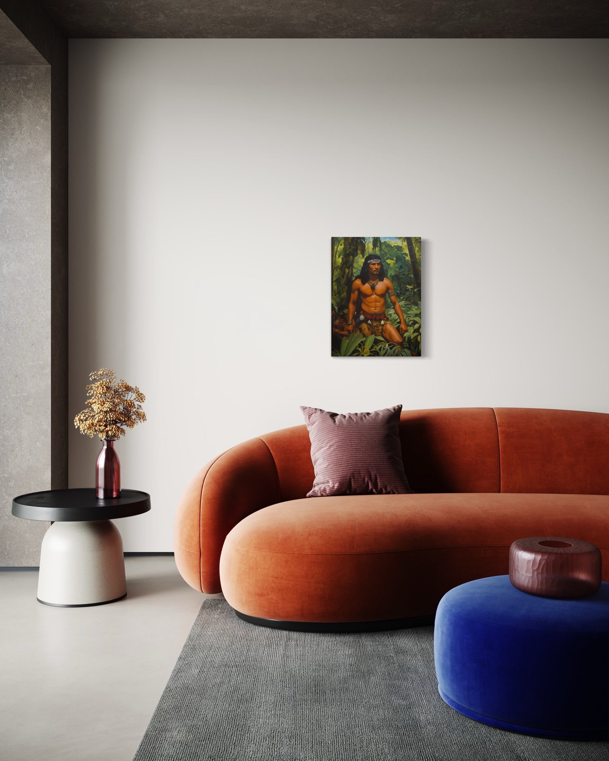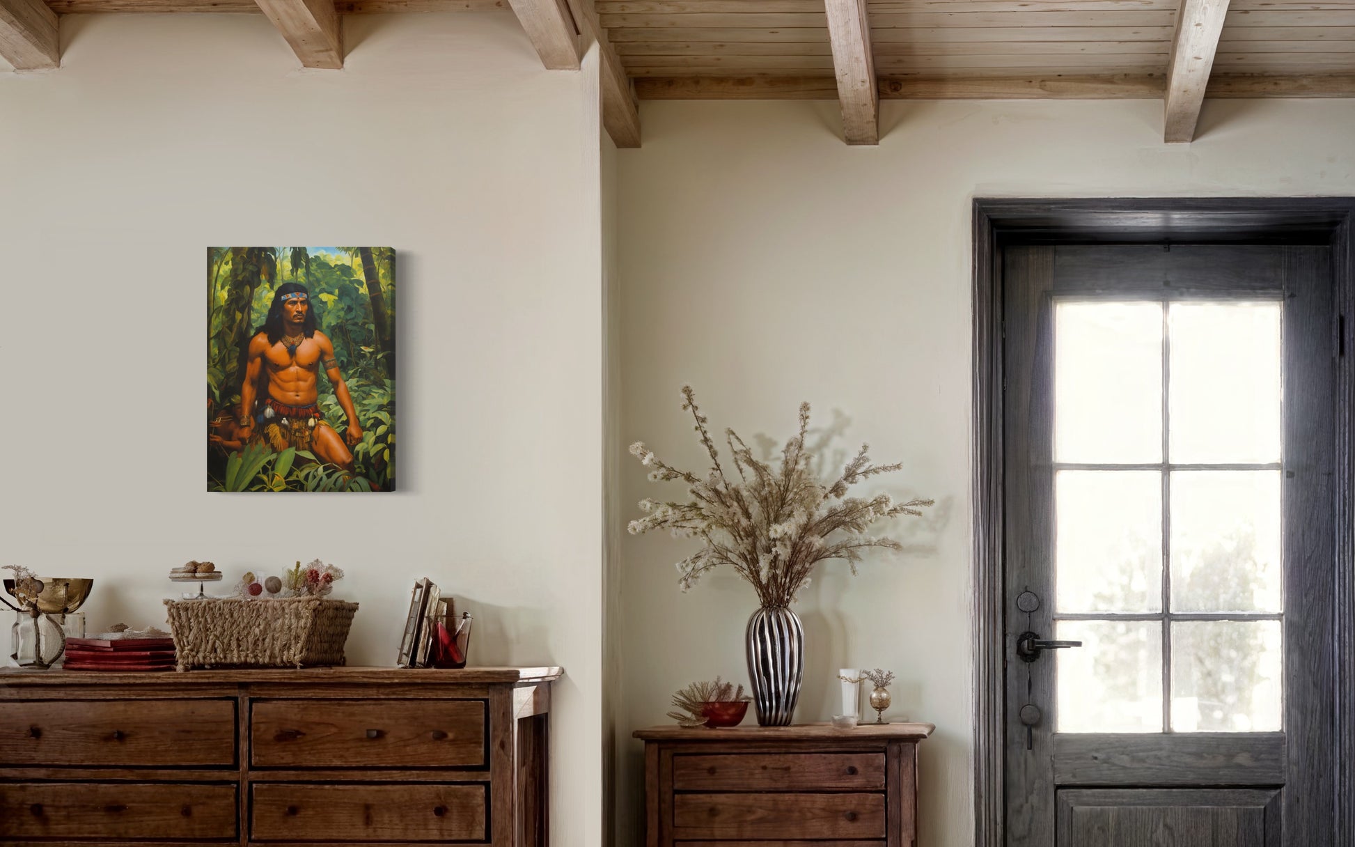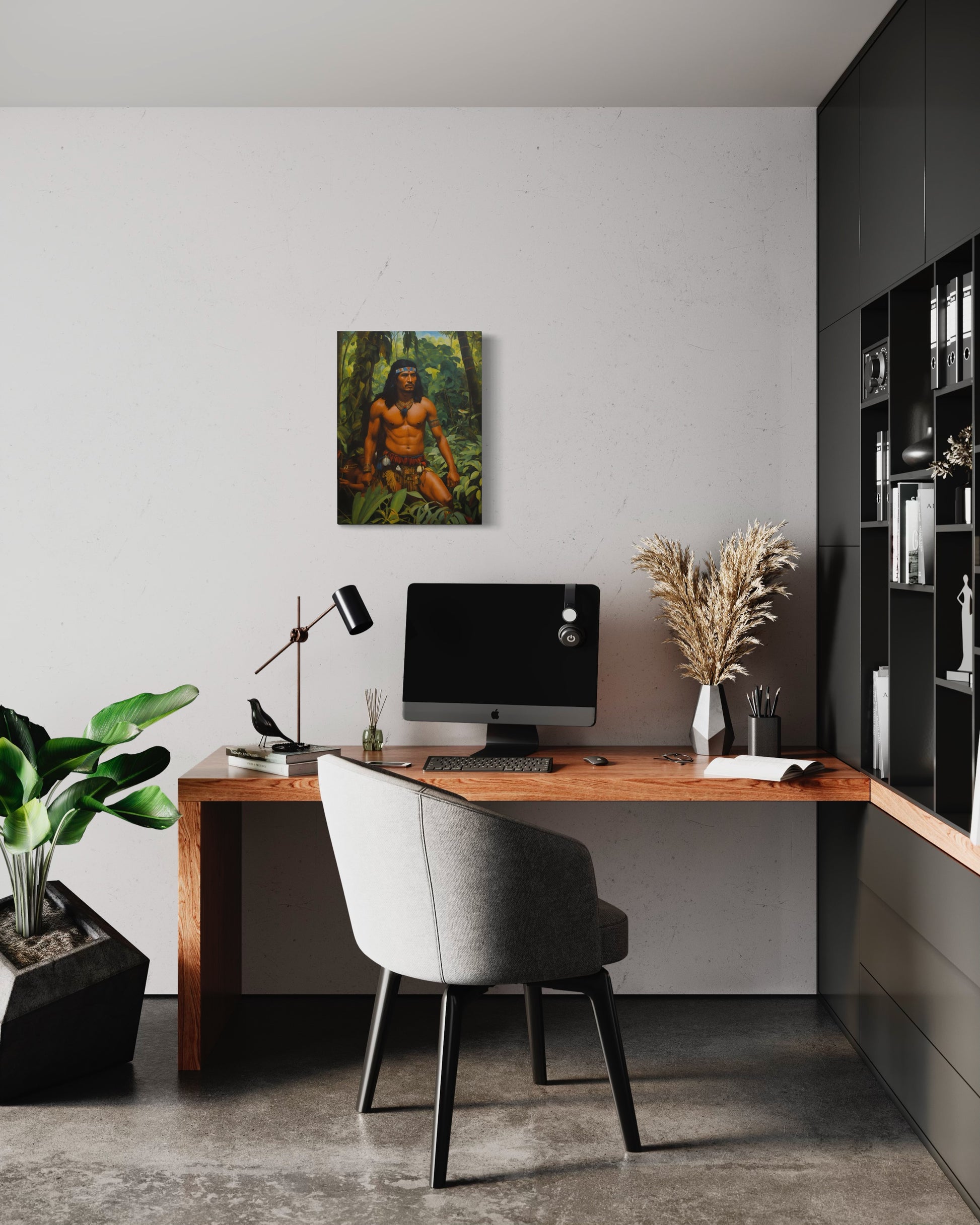 Der Krieger, mit kräftig definierten Muskeln und einem entschlossenen Blick, trägt traditionelle Stammeskleidung, die mit Federn und Schmuckstücken geschmückt ist. Seine imposante Haltung und die sorgfältig ausgewählten Accessoires betonen seine Autorität und sein tiefes Verständnis für die ihn umgebende Natur. Der Kopfschmuck und die Halskette aus Perlen und Federn unterstreichen seine Zugehörigkeit und seinen hohen Status innerhalb seines Stammes.