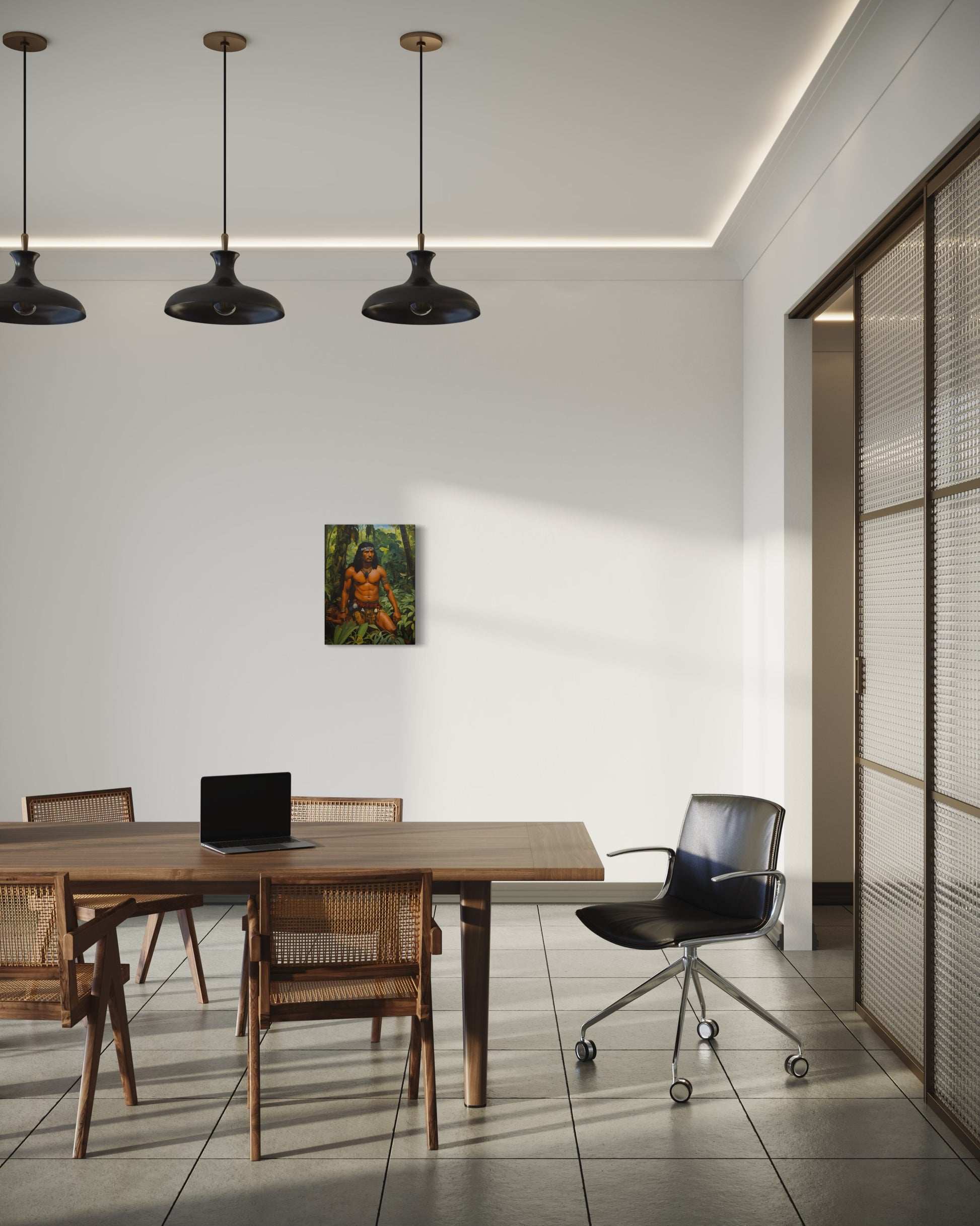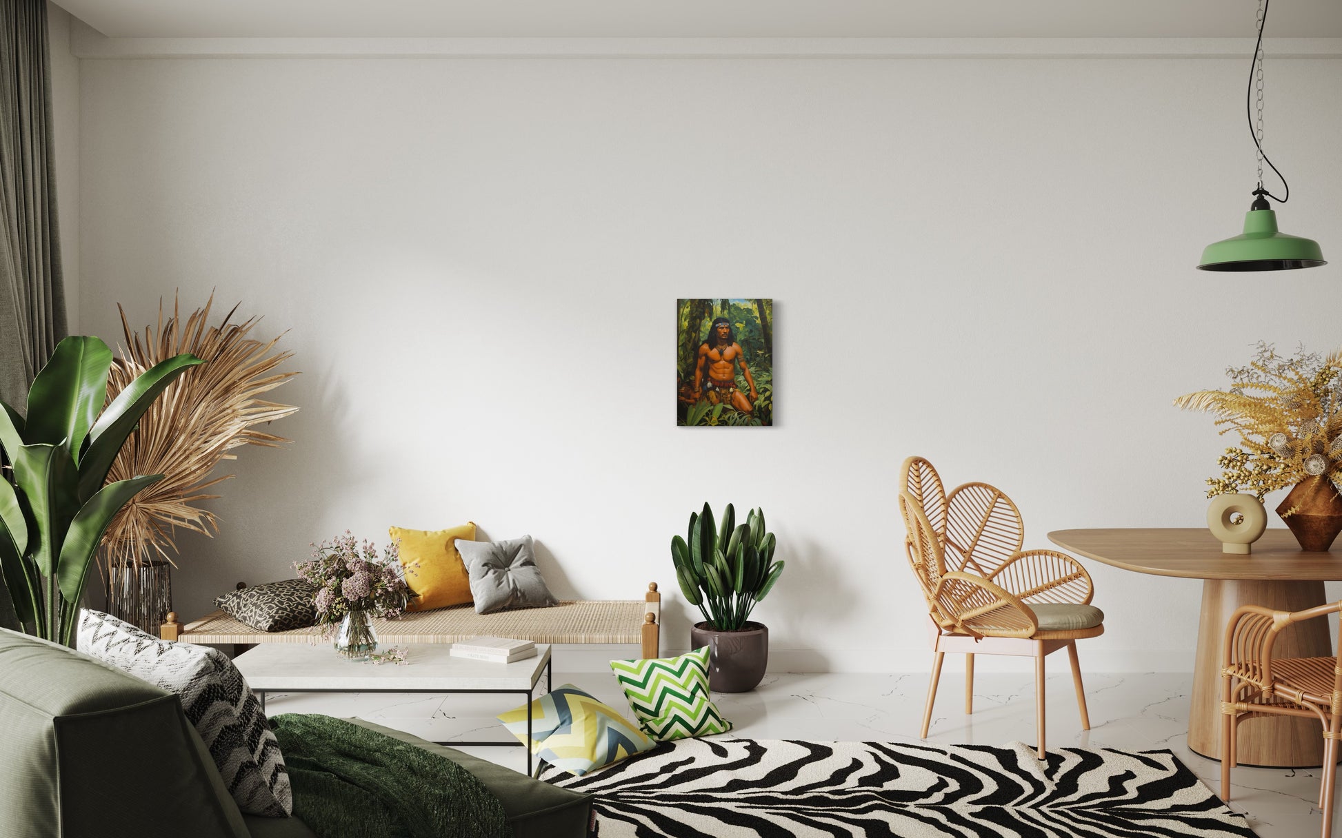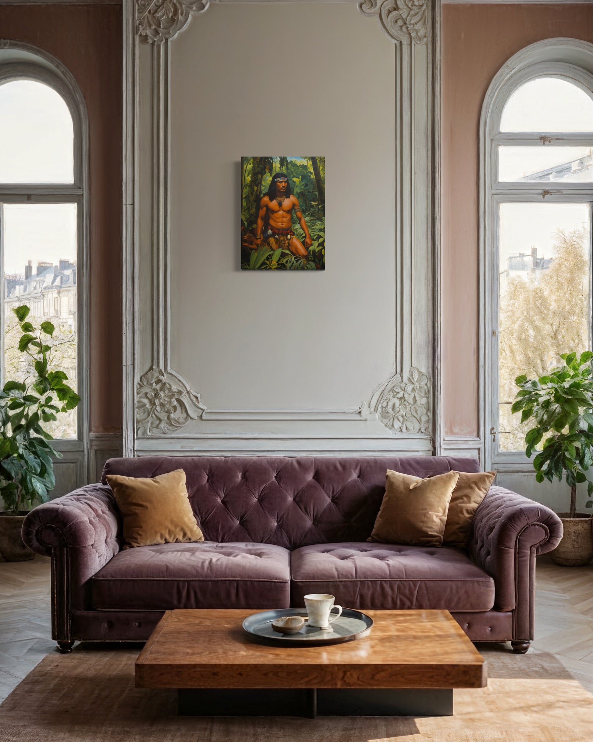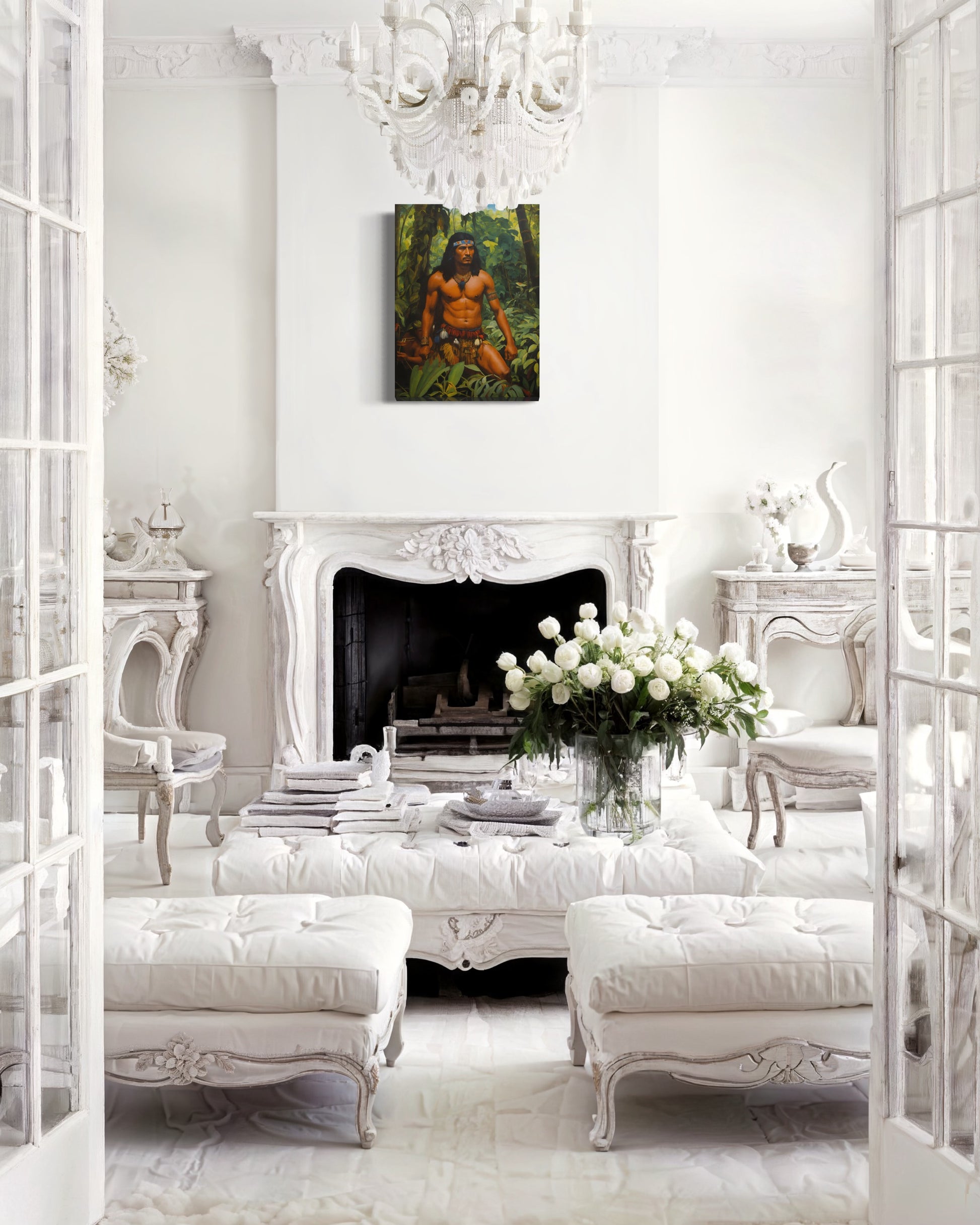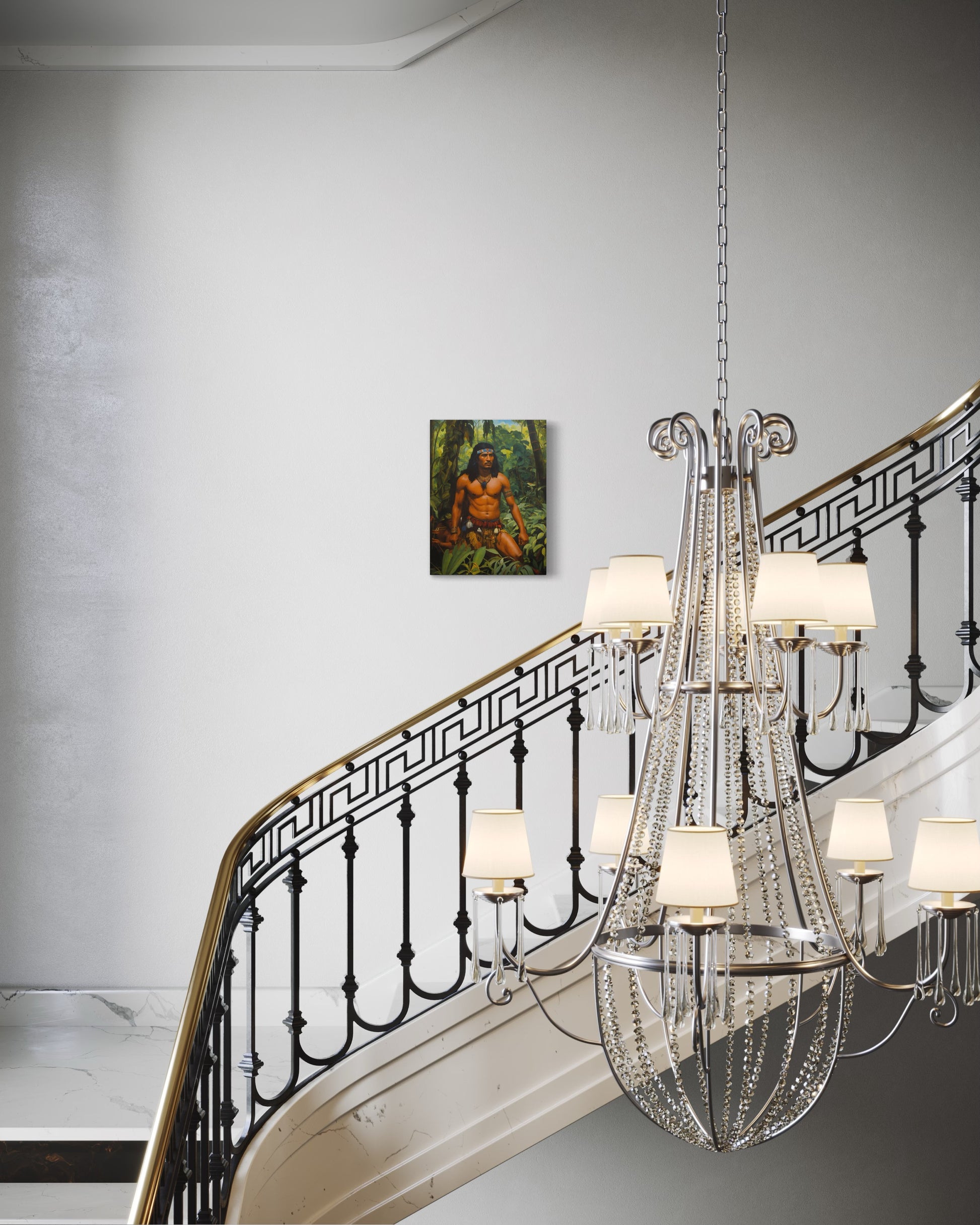Der Krieger, mit kräftig definierten Muskeln und einem entschlossenen Blick, trägt traditionelle Stammeskleidung, die mit Federn und Schmuckstücken geschmückt ist. Seine imposante Haltung und die sorgfältig ausgewählten Accessoires betonen seine Autorität und sein tiefes Verständnis für die ihn umgebende Natur. Der Kopfschmuck und die Halskette aus Perlen und Federn unterstreichen seine Zugehörigkeit und seinen hohen Status innerhalb seines Stammes.