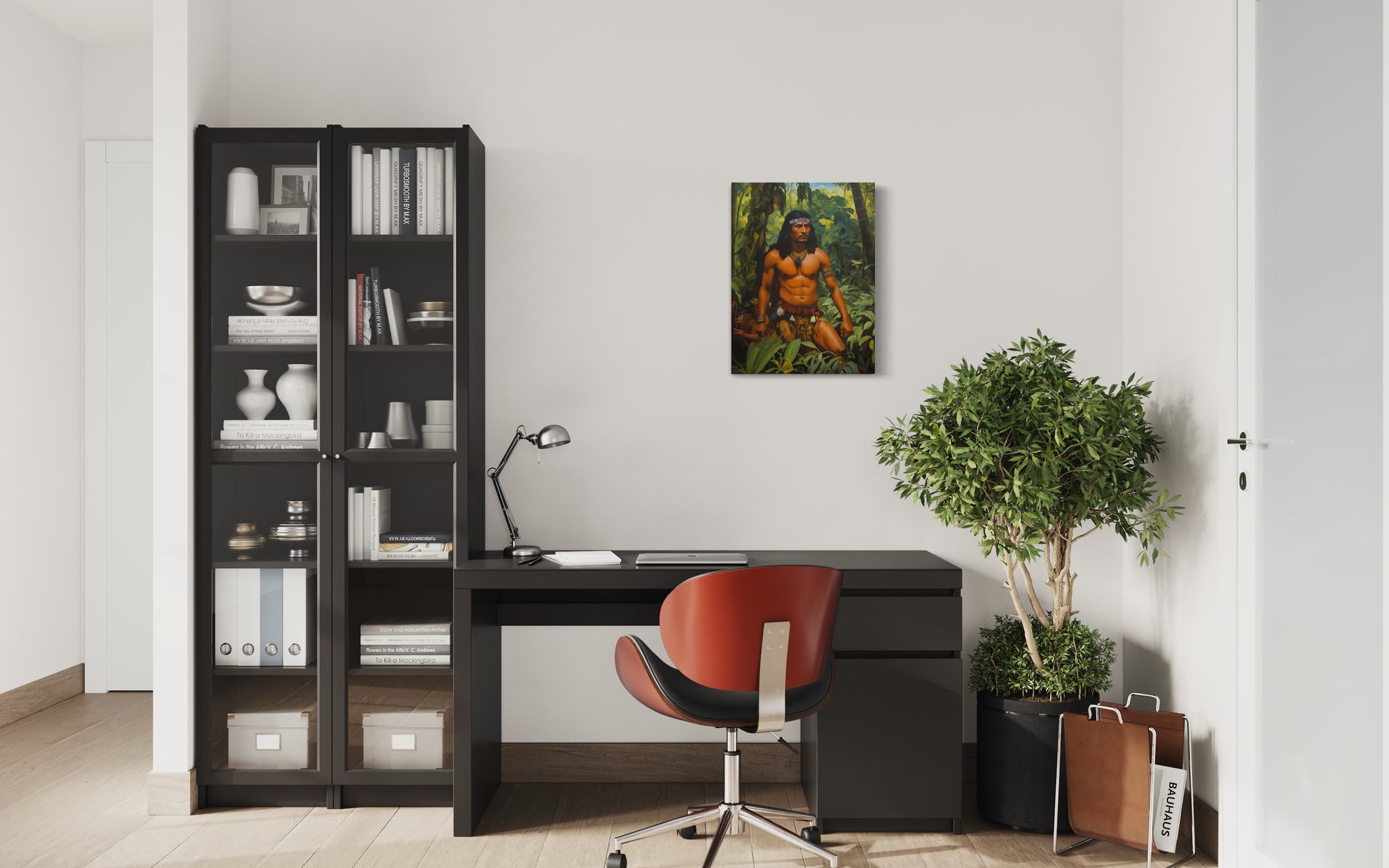 Dieses beeindruckende Gemälde, betitelt "The Warrior from Amazon," fängt die Essenz und Stärke eines Amazonas-Kriegers in seiner natürlichen Umgebung ein. Die meisterhafte Darstellung des Kriegers zeigt ihn als Symbol von Tapferkeit und Stolz, während er durch die üppige Vegetation des dichten Regenwaldes schreitet.